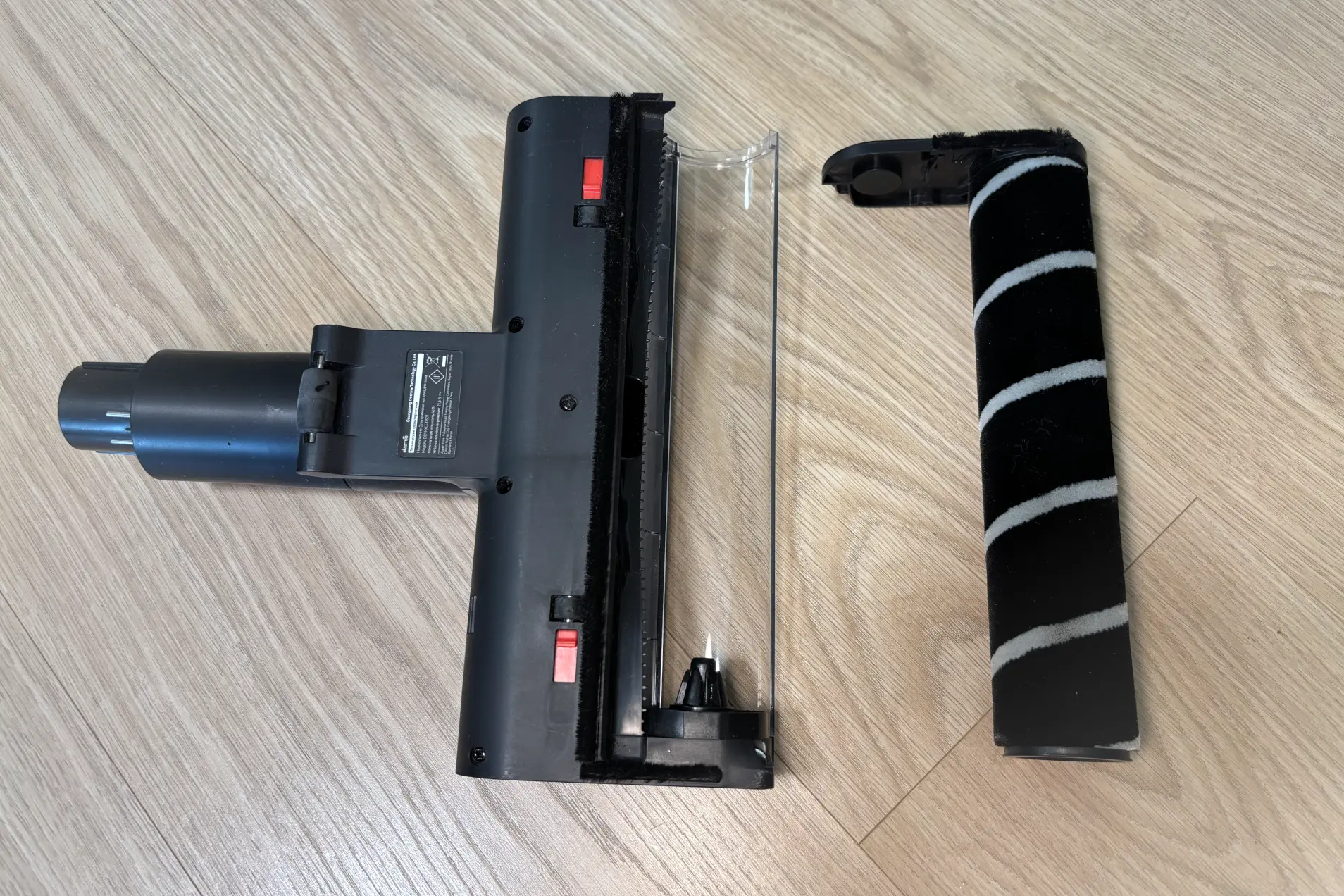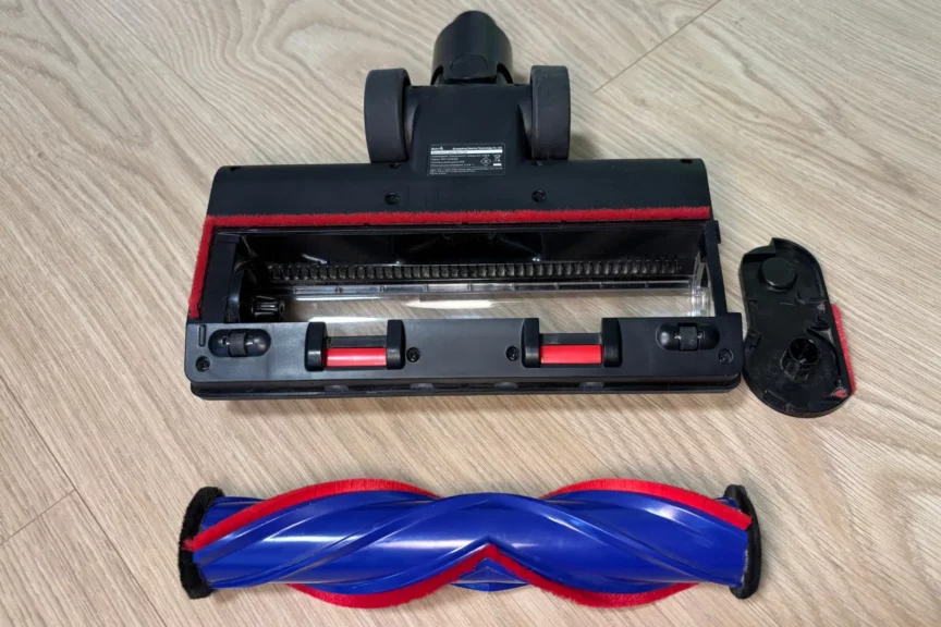 Колесики щетки съемные. Их легко чистить от волос и шерсти. Ролик также съемный. За ним расположена расческа, которая не дает наматываться волосам. По краям насадки есть щеточки, которые помогают убирать пыль рядом с плинтусом.