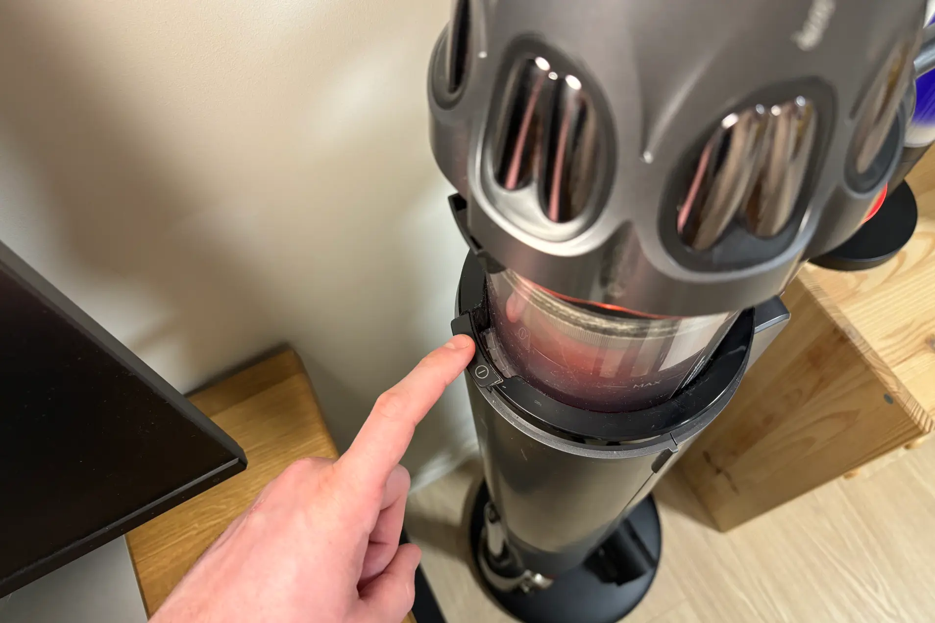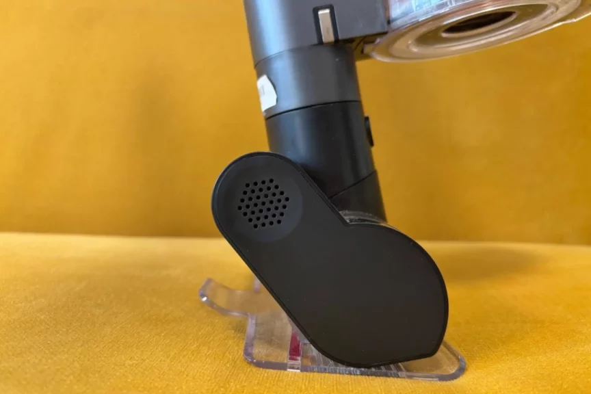 У основного блока съемный аккумулятор, а также разъемный пылесборник. На корпусе есть удобный рычаг, который прессует весь мусор и счищает его с сетки. При нажатии до упора колба открывается. Сам пылесборник можно снять и промыть. Не хватает одной мелочи — продуманного места для хранения насадок, потому что на настенном держателе можно хранить максимум две.