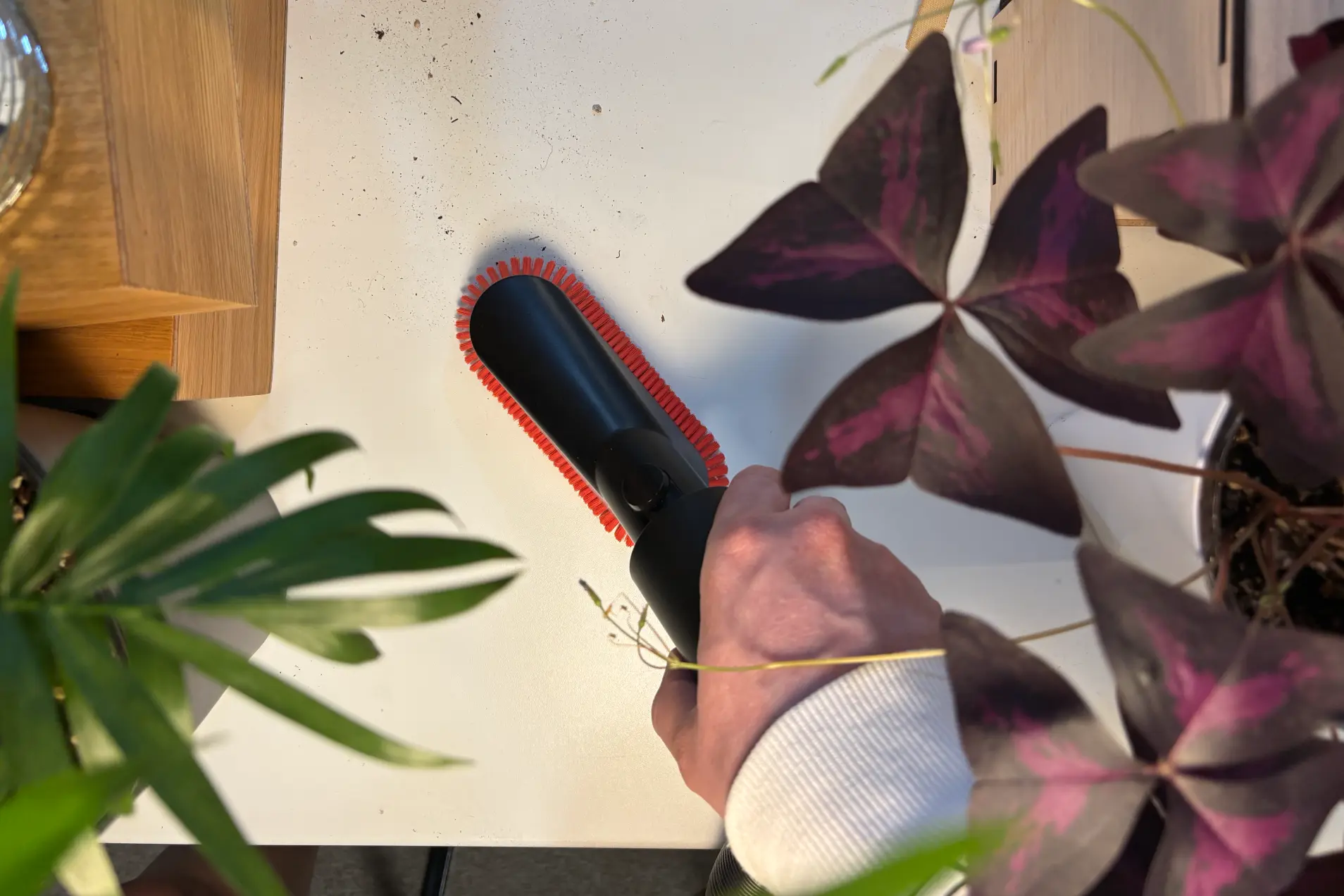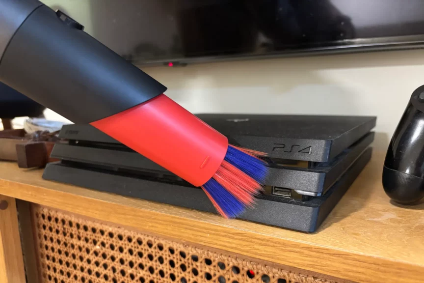 Для деликатной уборки устанавливаем щетку с мягким ворсом. Если повернуть трубку, щетинки уберутся. Насадка отлично подошла для чистки плинтусов. Они белого цвета (как и стены), и от обычной щелевой насадки остается след. С этой же уборка получается более аккуратной. Можно пропылесосить клавиатуру, системник или приставку, пройтись по телевизору или монитору.