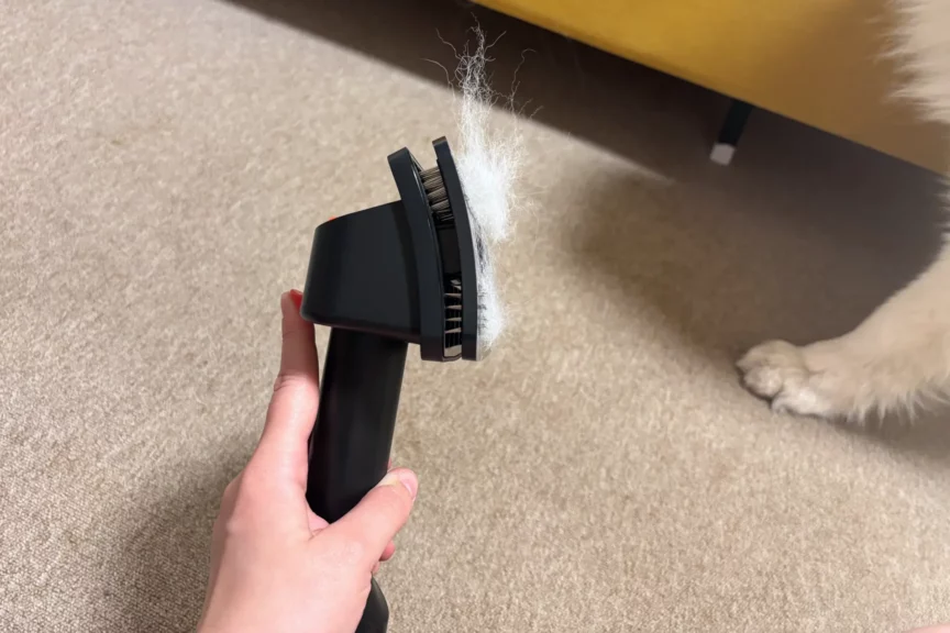 Для вычесывания домашних любимцев предусмотрена отдельная насадка. Это щетка-расческа со специальным рычагом. Достаточно начать расчесывать своего пушистого друга, собрать небольшое количество шерсти и включить пылесос. При нажатии на рычаг шерсть засасывается.