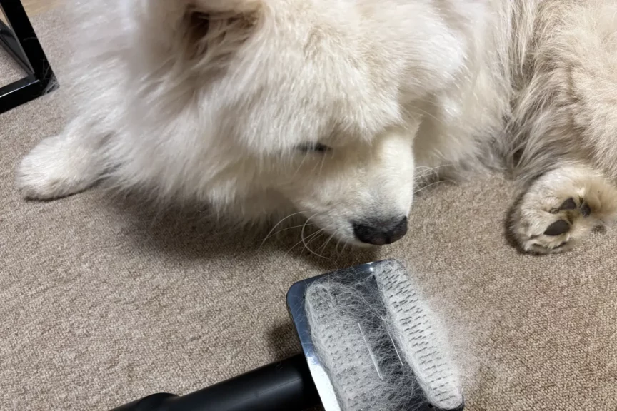 Такой домашний груминг подойдет для кошек и собак средней пушистости (корги, ретриверы). Но и мой длинношерстный самоед вполне нормально перенес новый для себя способ вычесывания.