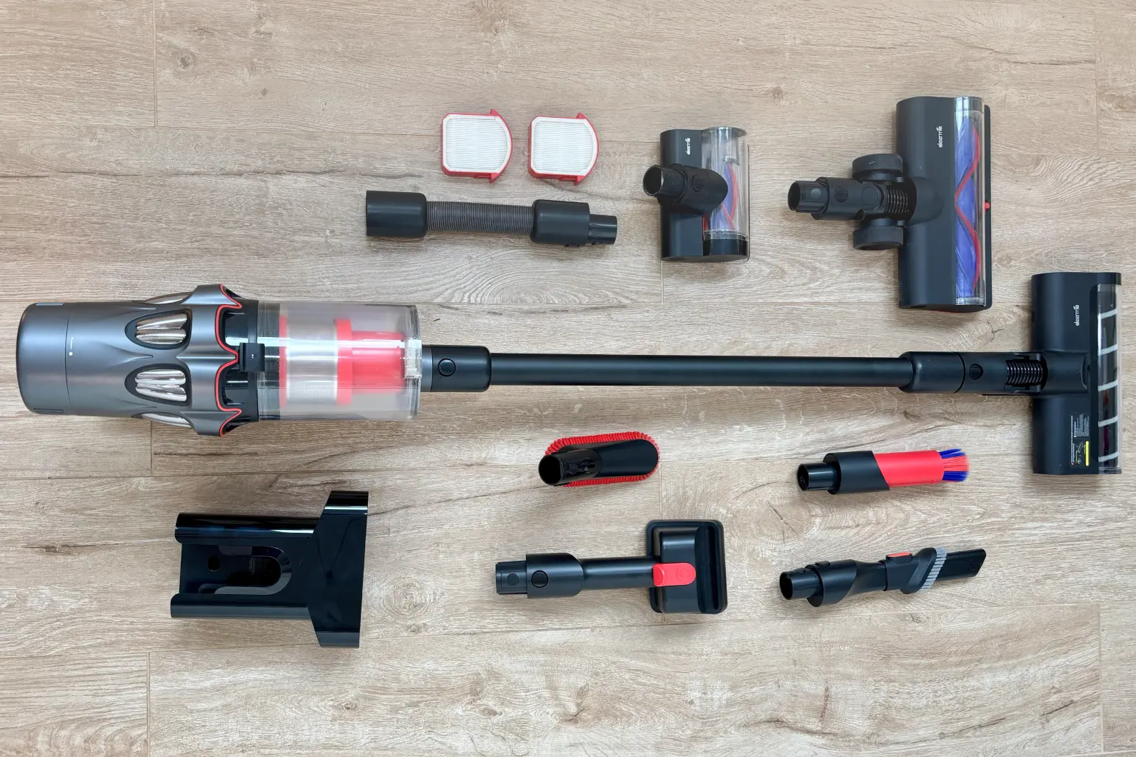 Все тесты Deerma DEM-T50W Station сдал на отлично. Пылесос мощный, качество уборки высокое, шерсть и волосы не наматываются на роликовую щетку. Дополнительные насадки помогают в борьбе за чистоту помещения. На всех деталях есть информационные наклейки — не нужно читать инструкцию. Станция берет на себя работу по зарядке и чистке пылесоса, а аллергики точно оценят систему фильтрации.