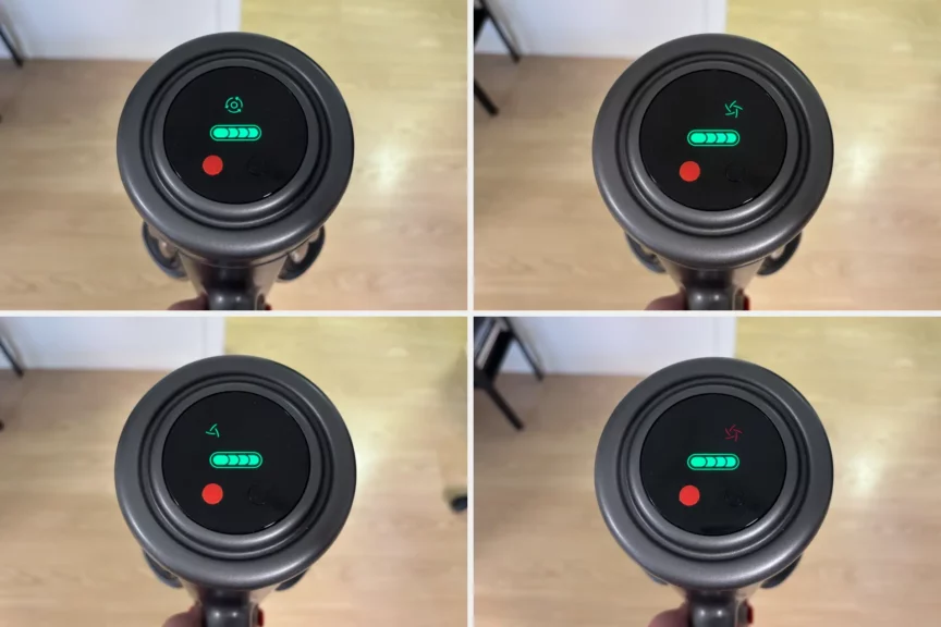 На торце основного блока расположен дисплей с индикатором заряда батареи и двумя кнопками: «вкл/выкл» и «переключение режимов». Режимов всего четыре: энергосберегающий, стандартный, сильный и турбо, который тут называется «Яростным». Последний можно включить, если нажать на кнопку переключения и удерживать ее пять секунд. После чего пылесос начинает работать на максимуме своих возможностей, с силой втягивая пыль и прочий мусор.