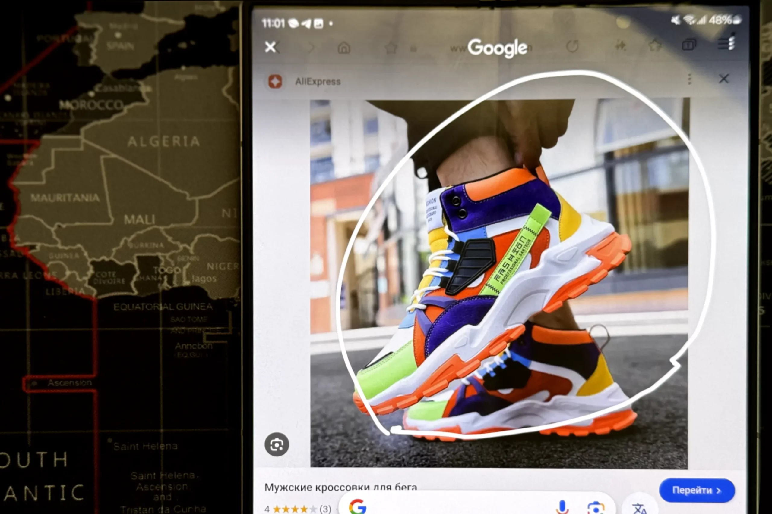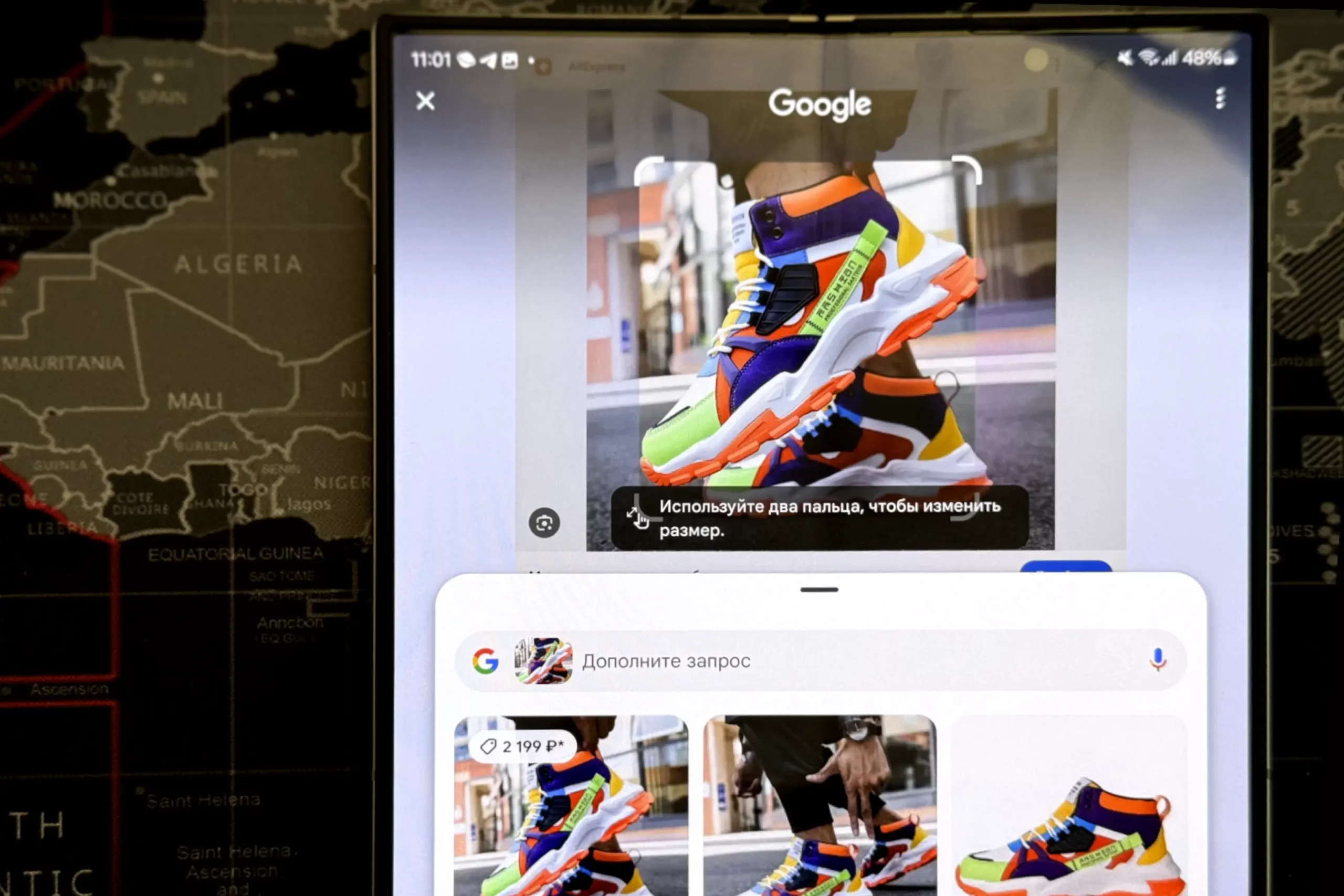 «Обвести и найти» (Circle to Search) — фишка, которая появилась еще в Samsung S24 Ultra, а теперь доступна и на Z Fold 6. Запускается она нажатием на центральную кнопку, позволяя обвести любой объект на экране и найти информацию о нем в интернете. Более того, вы можете запустить камеру смартфона, если вам, например, понравились кроссовки стоящего напротив парня. Обвели их на фото и узнали все про модель и где их сейчас можно купить. Как по мне, это очень крутая фича!