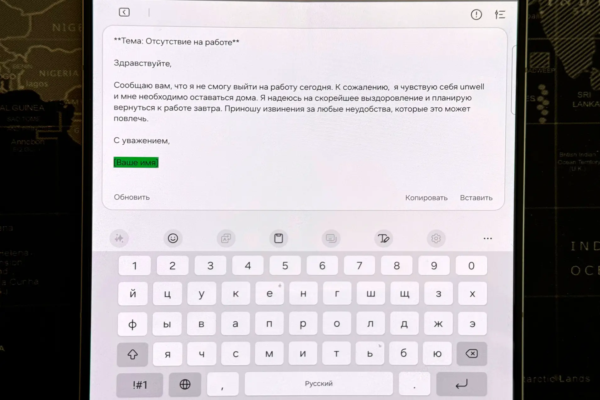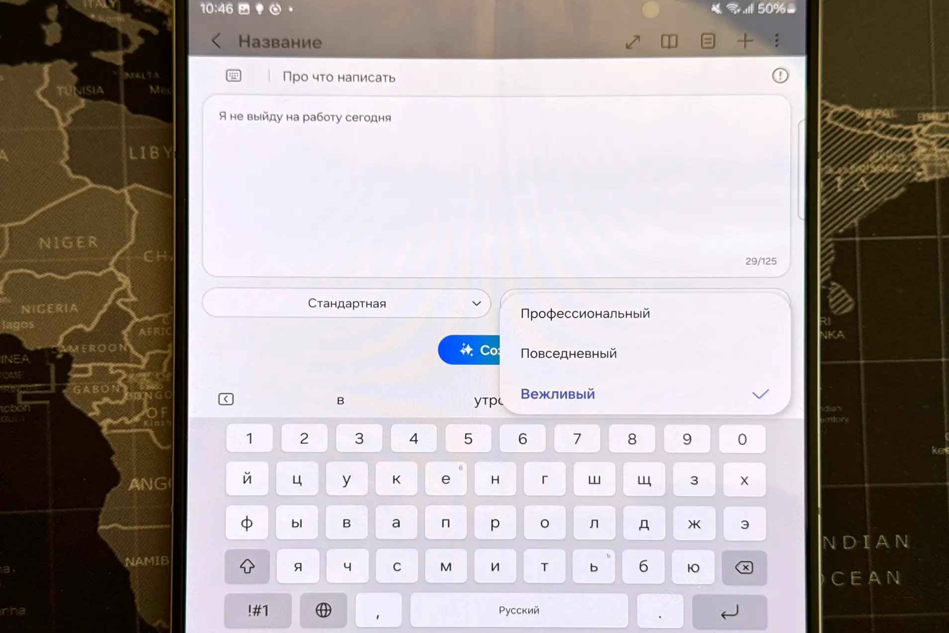 «Ассистент для заметок» (Note Assist) переведет, резюмирует и автоматически отформатирует заметки. Чтобы активировать AI-функции на Z Fold 6, вам нужно нажать на три звездочки на рабочей панели. Как это работает: вот я написала текст и хочу его отправить, например, сообщением работодателю. Допустим, я неважно себя чувствую, но написать хочу красиво. Для этого ИИ предлагает мне не только проверить грамматику и орфографию, но и задать стиль письма: вежливый, повседневный и профессиональный. А также выбрать, как его направить: стандартной формой, на электронную почту, в социальные сети или в формате ответа на комментарий.