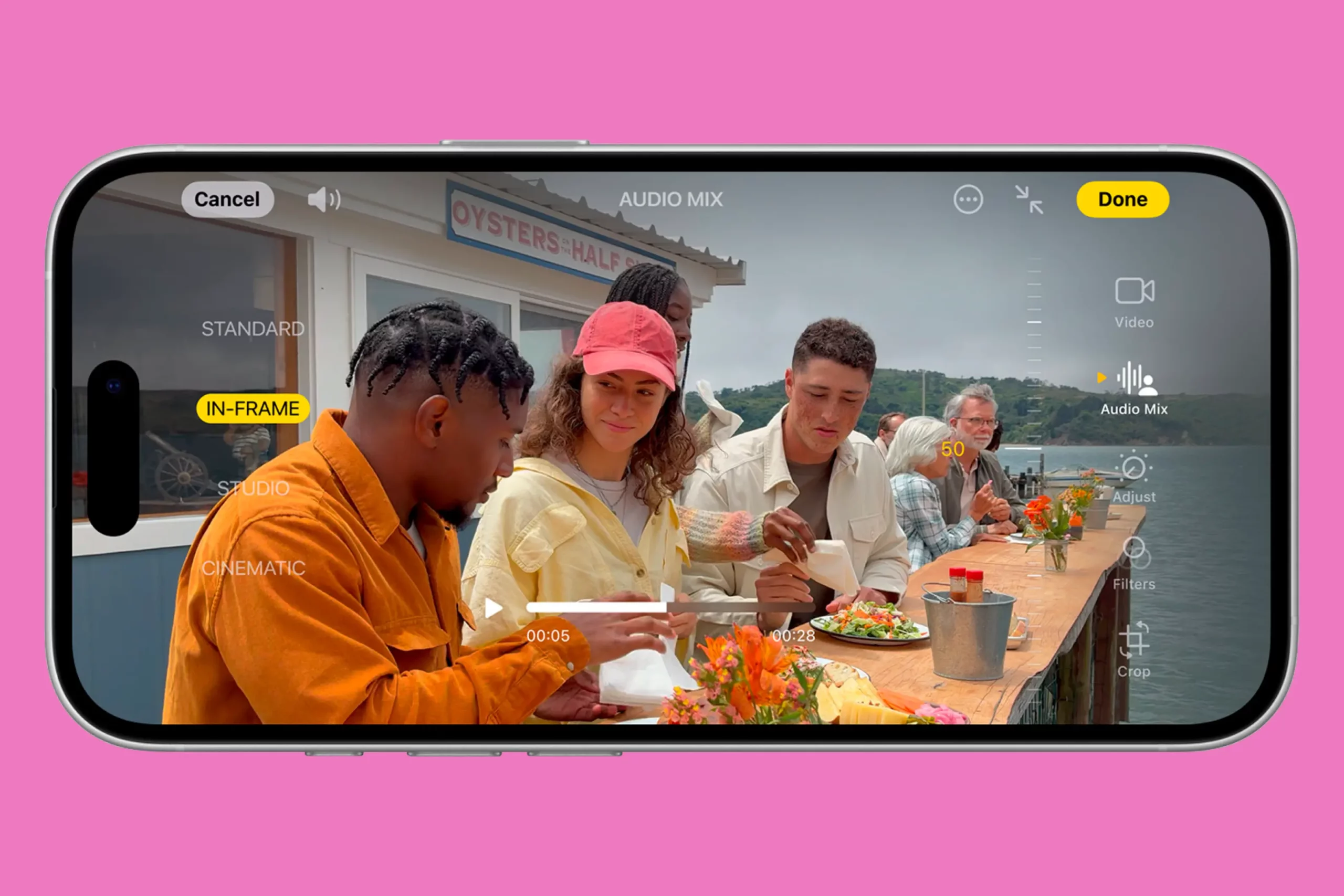 Еще одно отличие iPhone 16 от прошлогодней модели — новый режим Audio Mix, позволяющий управлять тем, как смартфон записывает звук во время съемки видео. Например, можно убрать все посторонние шумы, сосредоточившись только на голосах людей в кадре.