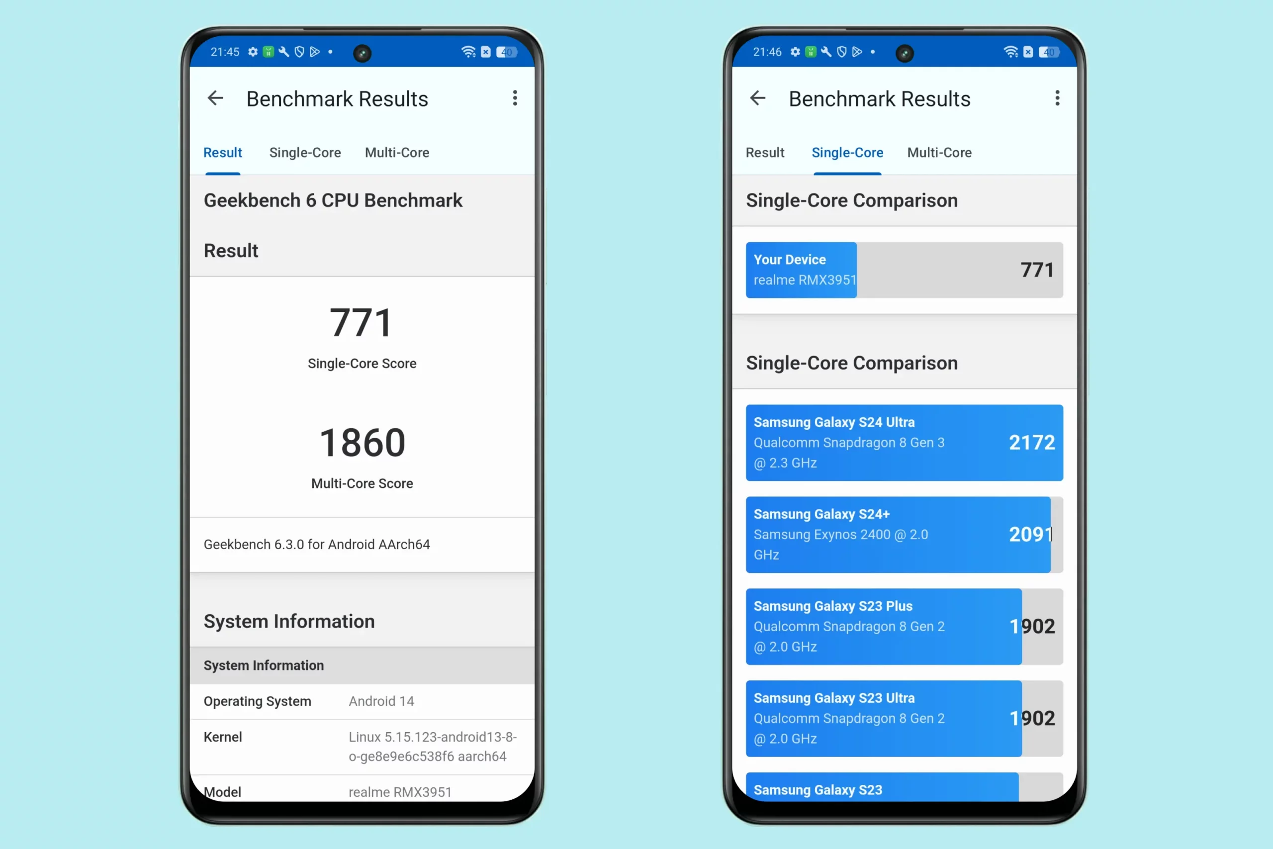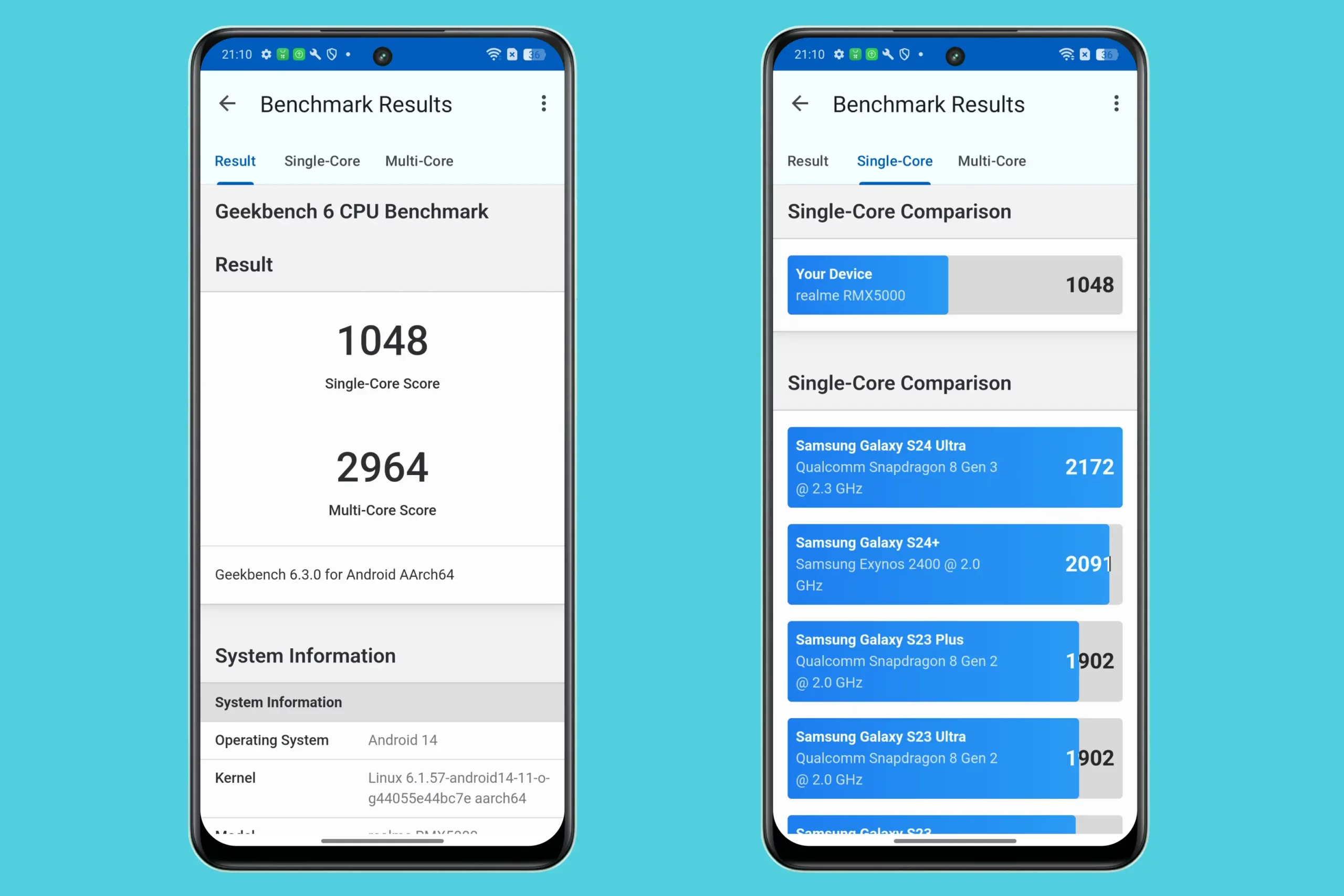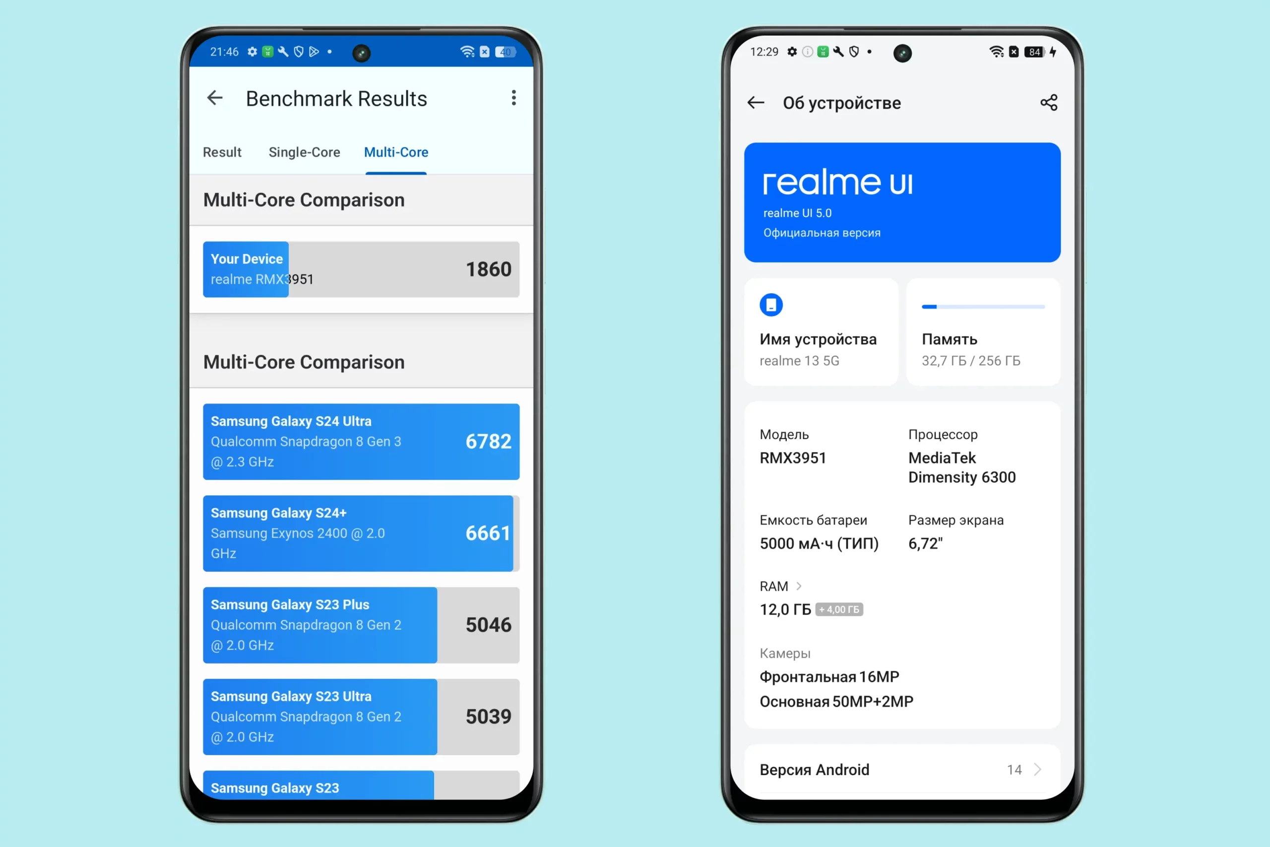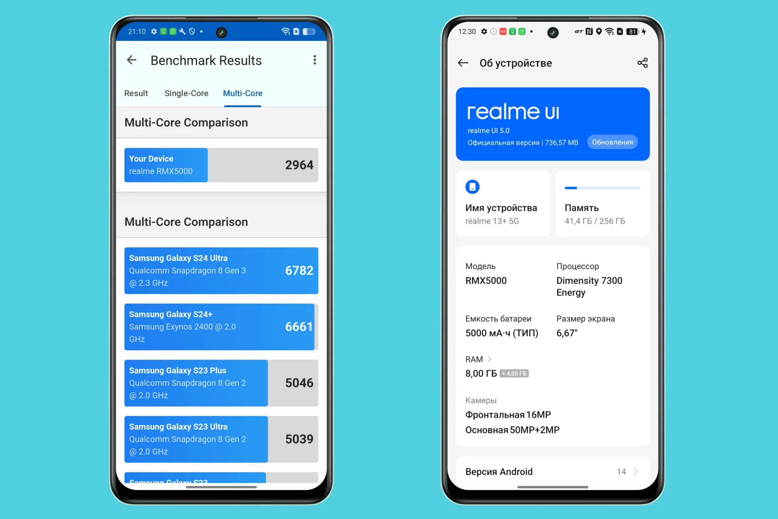 Памяти тоже хватает: у младшей модели — 12 ГБ оперативной и 256 встроенной, у старшей — 8 ГБ и 12 ГБ оперативной и 256 хранилища. Оба работают на Android 14 со своей фирменной оболочкой — realme UI 5.0. В Benchmark realme 13 5G в одноядерном режиме показал 771 балл, а в многоядерном — 1860 баллов. Это средний показатель. А вот у realme 13+ 5G все намного лучше: в одноядерном — 1048 баллов, в многоядерном — 2964. Для среднебюджетника очень хороший показатель!