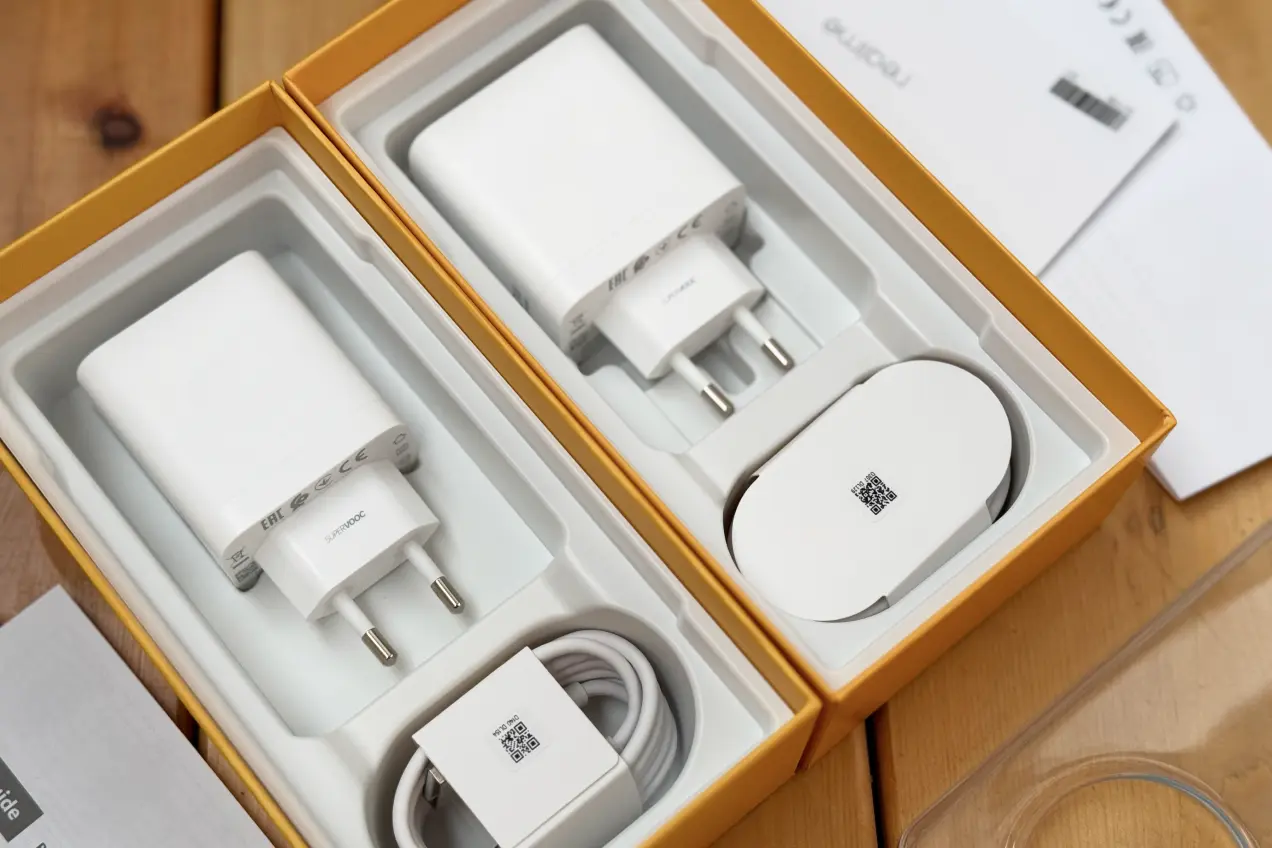 По комплектации все стандартно: желтые коробки, необходимая документация, скрепка для SIM-карт, прозрачные силиконовые чехлы, кабели зарядки USB Type-C и фирменные блоки питания на 80 Вт у realme 13+ 5G и на 45 Вт у 13 5G.