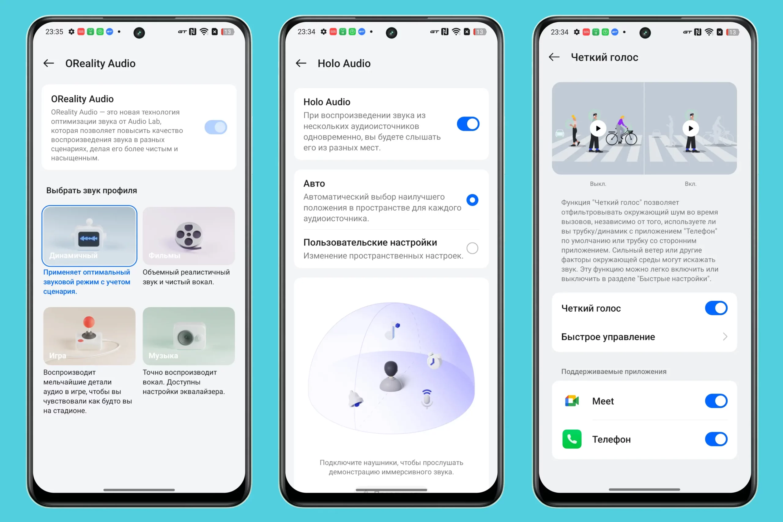 Стерео хоть и простейшие, но есть свои интересные фишки. Первое, что я заметила, — это разные режимы аудио. Например, у realme 13 5G есть ORealityAudio, где можно выбрать звук профиля: «Динамичный», «Фильмы», «Игра» и «Музыка». А у realme 13+ 5G помимо нее есть еще и Holo Audio, который помогает сбалансировать звук, если вы в наушниках. А также функция «Четкий голос», то есть некий фильтр, который поможет, если вы разговариваете по телефону, а на улице сильный ветер.