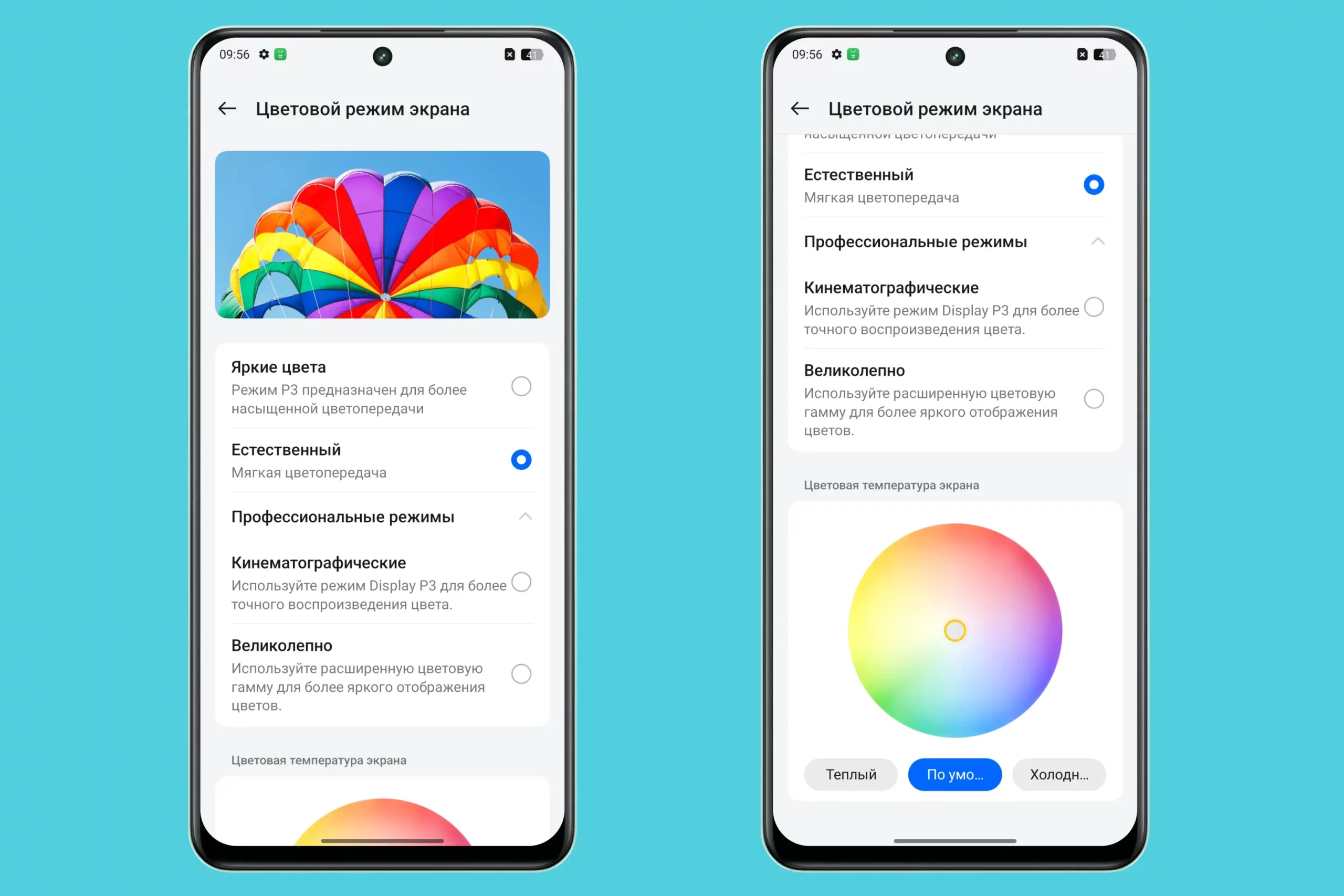 Что касается старшей модели, то тут 6,67 дюймовый OLED-дисплей с частотой обновления 120 Гц и пиковой яркостью 2000 нит. Разрешение 2400×1080 точек, а плотность — 395 ppi. Работа в интернете, скроллинг новостей и просто повседневные задачи — плавные, отклик быстрый. Есть поддержка HDR-контента. Частоту обновления можно настроить максимальную, перевести на 60 Гц или поставить авторегулировку. Рамки дисплея хоть и не самые тонкие, но в целом все смотрится очень даже хорошо. При этом есть Always On Display и физический датчик приближения (полезно во время звонков). Но стоит отметить, что есть ШИМ. Также в настройках можно увидеть и привычную регулировку яркости, но я впервые увидела режимы ее настройки: «яркий», «естественный», «профессиональный», «кинематографический» и «великолепный».