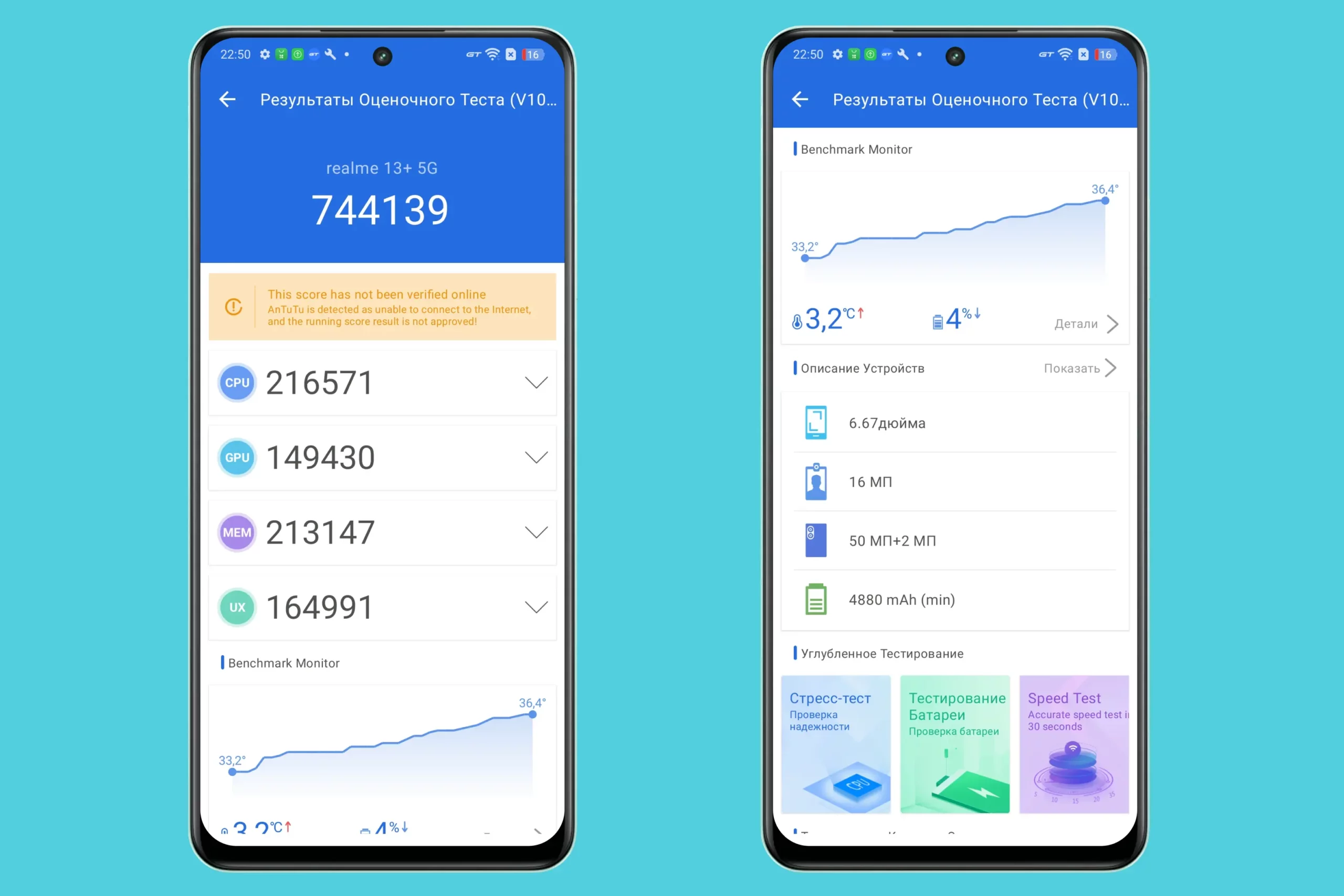 А вот у realme 13 5G процессор — Dimensity 6300. Поскромнее, чем Dimensity 7300, но тоже достаточно добротный. В тех же PUBG: Mobile и Call of Duty: Mobile чуть-чуть не дотягивает до 60 кадров в секунду. А так, в повседневных задачах этот смартфон — универсальный боец: шустрый, без лагов и зависаний. Да, он не летает, но работает с комфортной скоростью. В AnTuTu набирает 460 000 (у меня вышло 248 677) баллов, неплохой показатель. Но советую требовательные игры опускать на средние настройки, простые же — пойдут без проблем. Почему получились разные результаты, спросите вы? У компании realme, например, эти показатели значительно выше за счет идеальных условий тестирования. В моем случае смартфоны были нагреты после активного и долгого тестирования.