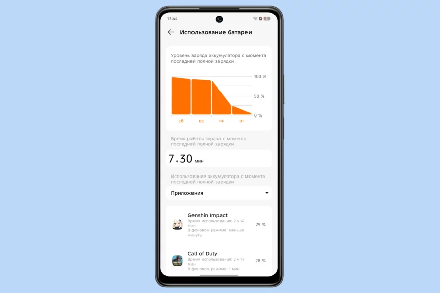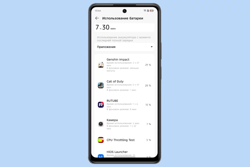 Час просмотра видео на Rutube с максимальной яркостью «съедает» 7% запаса энергии, час игры в Call of Duty Mobile — около 13%. Цифры не рекордные, но стоит помнить, что в смартфонах бюджетного класса используются не столь энергоэффективные процессоры, как во флагманах. Большая емкость аккумулятора здесь особенно важна!