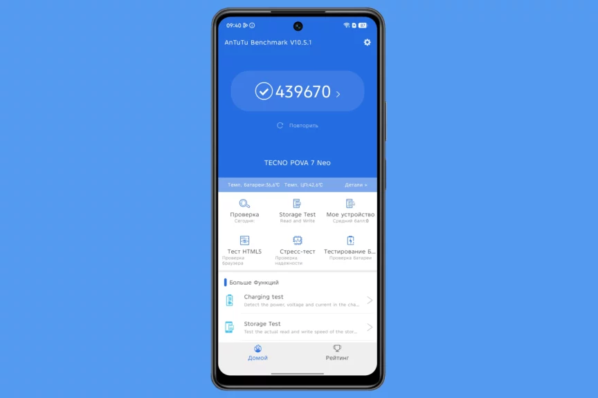 Процессор MediaTek Helio G100 Ultimate по характеристикам предельно близок к G99, который долгое время устанавливался в смартфоны среднего и бюджетного класса. G100 — довольно удачная модель, которая обеспечивает достаточную производительность для повседневных задач и даже игр. Цифры синтетических тестов это подтверждают. Чип не склонен к перегреву и почти не проседает в производительности при длительной нагрузке. 8 ГБ оперативной памяти для повседневных задач также достаточно. Плюс ее объем можно увеличить на 3,5 или 8 ГБ за счет внутренней памяти.