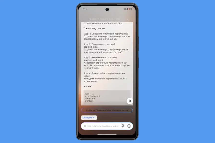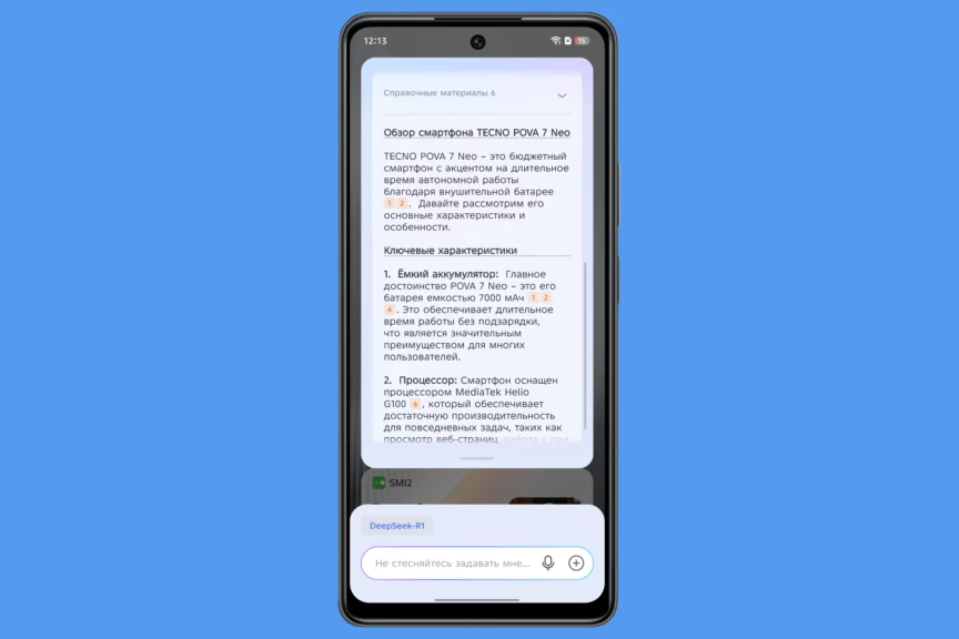 По умолчанию помощница работает на базе языковой модели собственной разработки TECNO AI, но ее легко переключить на DeepSeek R1. Умному ассистенту можно поручить искать информацию, генерировать текст и даже решать примеры из учебника по математике или информатике. Естественно, есть функции перевода, в том числе живого.
