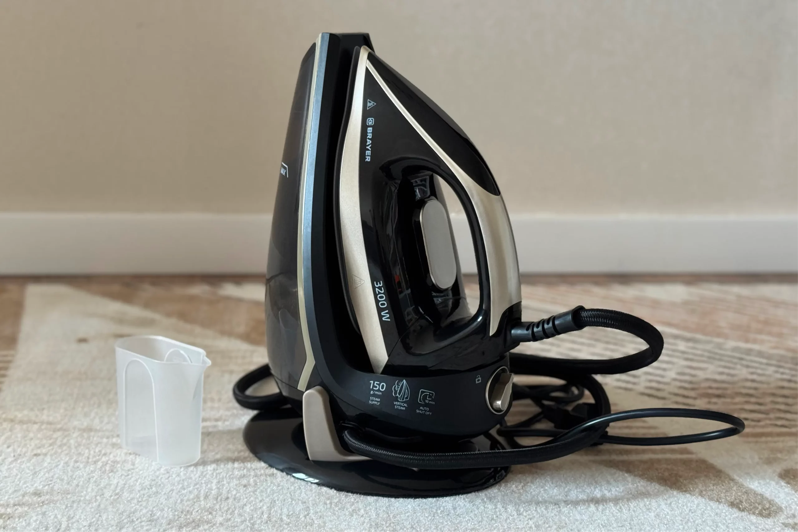 Внешний вид парогенератора серьезный — стильные черно-бежевые оттенки. Честно признаюсь, я думала, что он будет больше, так как в карточке товара его размер — 37,5×23,5×28 см — кажется весомым. Но на деле габариты оптимальные, слишком много места он не занимает. Но парогенератор не совсем уж маленький, это тоже стоит учитывать. В комплекте есть мерный стаканчик.