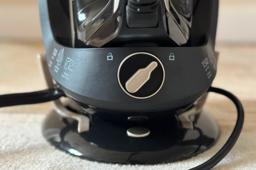 Пока активирована блокировка, утюг не сдвинется с места. Но стоит повернуть рукоятку влево — и он с легкостью снимается.