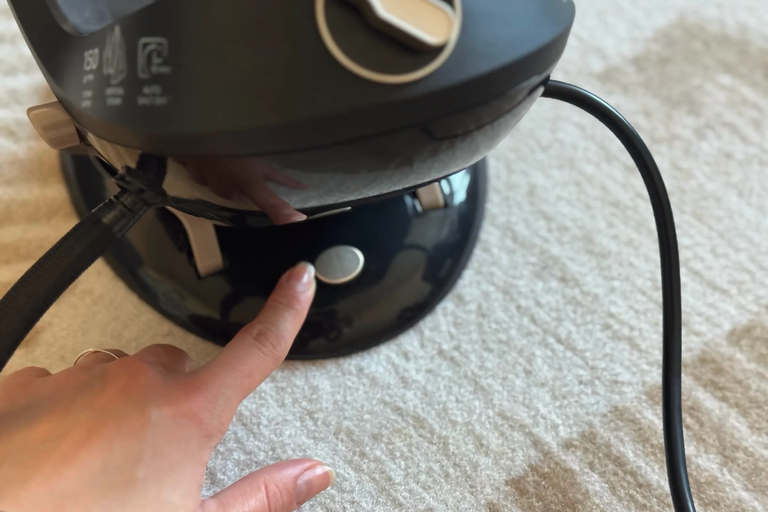 На самом утюге есть индикаторы включения и выключения устройства, подачи и отключения пара, недостаточного количества воды в резервуаре и включения режима самоочистки. Кнопки сенсорные. Чтобы запустить парогенератор, нужно нажать на кнопку включения и подержать несколько секунд. Когда устройство будет готово к работе, оно подаст вам звуковой сигнал (такой же, как и при включении), а сама кнопка включения будет гореть постоянно (без подмигиваний). Чтобы отключить пар или выбрать режим подачи (их здесь два), нажмите на кнопку «Подача пара», которая находится справа от кнопки включения.