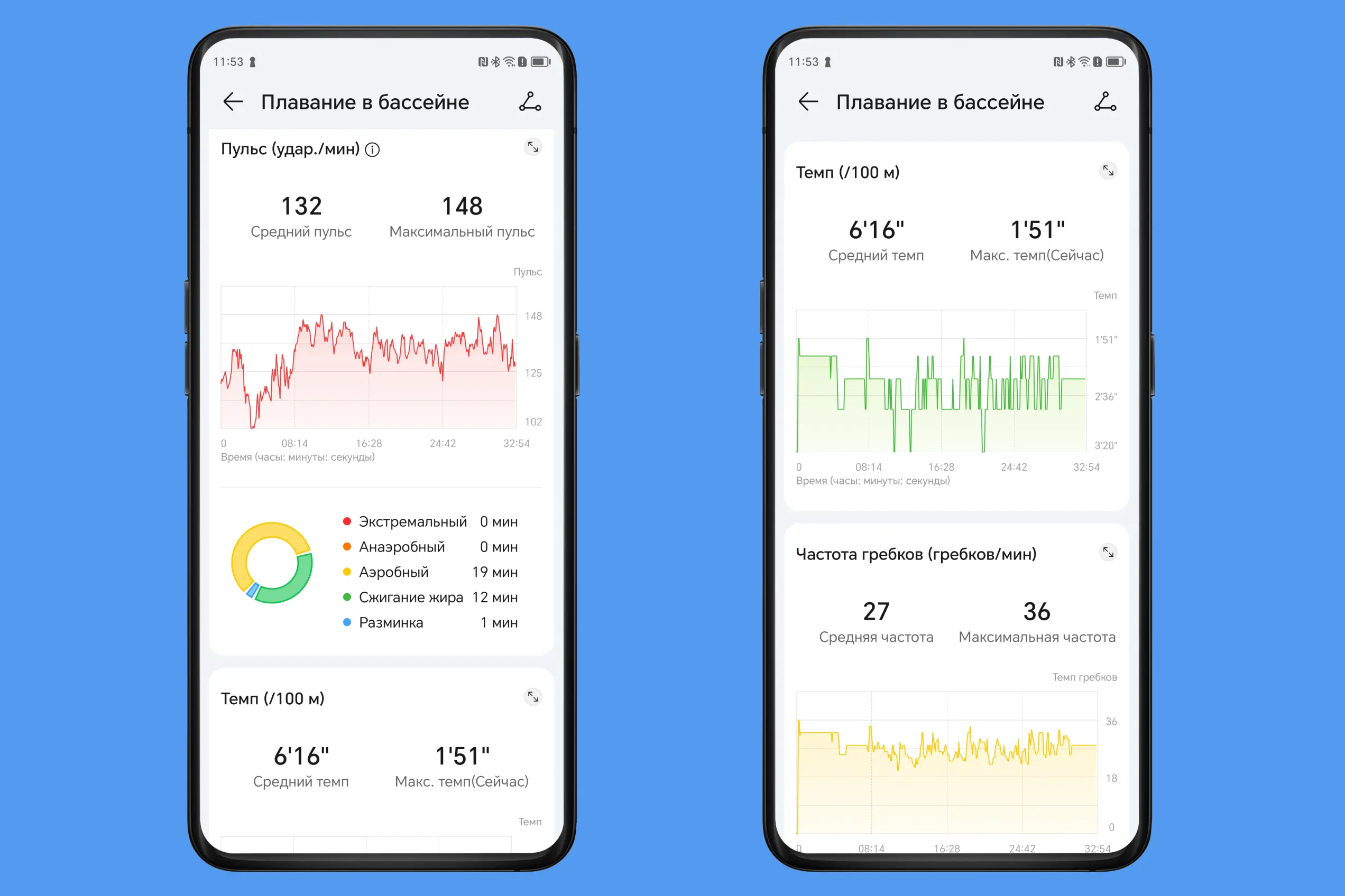 Плюсы приложения в связке с часами колоссальные: здесь собрана целая система для мониторинга вашего организма и отслеживания занятий спортом до мельчайших подробностей. Доступна аналитика активности и параметров организма, предустановлены спортивные тренировки. Например, если вы плаваете в бассейне, то вам будут доступны не только темп, пульс и скорость, но и количество и частота гребков, а также стиль плавания. Если вы бегаете или просто занимаетесь пешей прогулкой, то вам будет доступно время сжигания жира, разминка со всеми показателями активности. Очень полезно перед летним сезоном, не правда ли?
