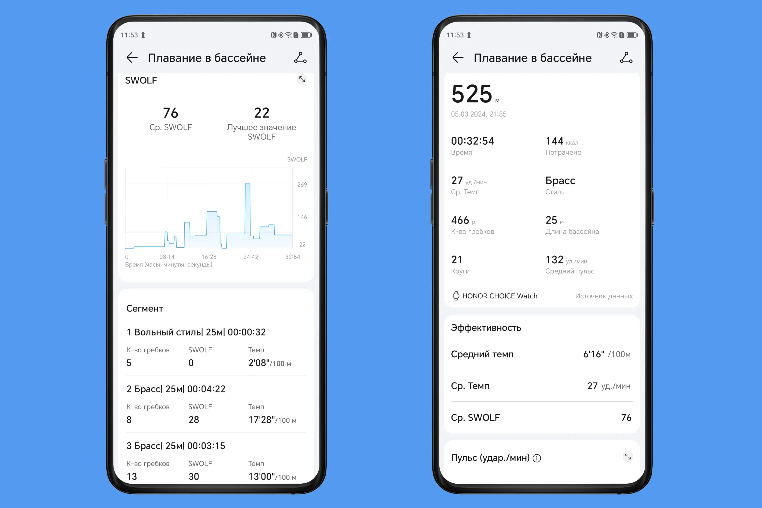 Я провела целый час в HONOR Choice Watch и полчаса в HONOR Watch 4 под водой — и все отлично, ничего не тупит, не скрипит, не лагает. Плавать очень удобно и в тех, и в других. Главное — потуже затянуть на запястье ремешок и встряхнуть кисть после плавания. Кстати, в обеих моделях я была и в хаммаме, и в русской бане примерно по 10−15 минут. Не уверена, что так можно было делать, но часы отлично справились с этими температурными испытаниями.