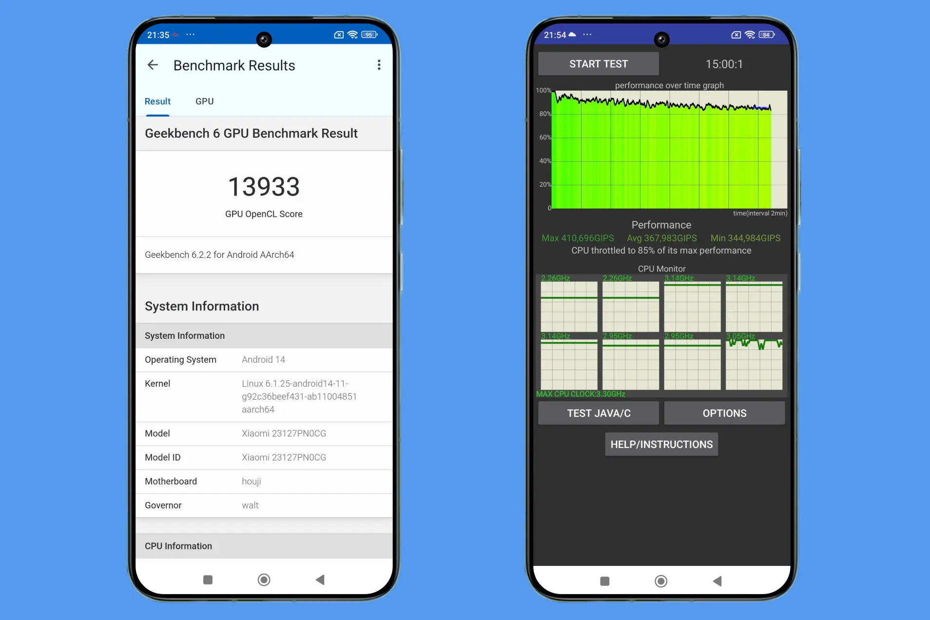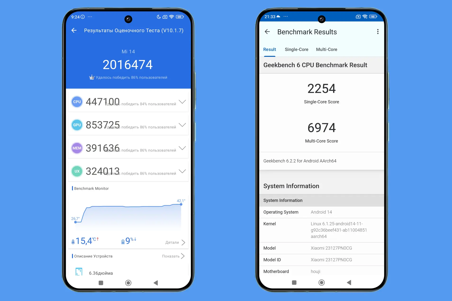 Другие характеристики Xiaomi 14 полностью соответствуют статусу флагмана. Он построен на самом современном чипсете Snapdragon 8 Gen 3. Это топовый процессор от Qualcomm, произведенный по 3 нм техпроцессу. В синтетических тестах он, что называется, жжет напалмом в прямом и переносном смысле. Цифры в синтетических тестах никого не оставят равнодушным (больше 2 млн баллов в AnTuTu!). Но расплата за это — сильный нагрев и прожорливость, троттлинг после 10−15 минут работы на максималках. При работе с тяжелыми играми смартфон греется и довольно быстро ест батарею. Зато тянет все на полных настройках качества и позволяет получать максимум удовольствия от игрового процесса.
