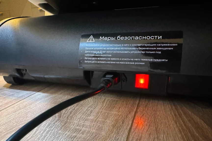 Прежде чем активировать работу кресла, его нужно подключить к сети и включить. Разъем и кнопка включения находятся с тыльной стороны, в самом низу.
