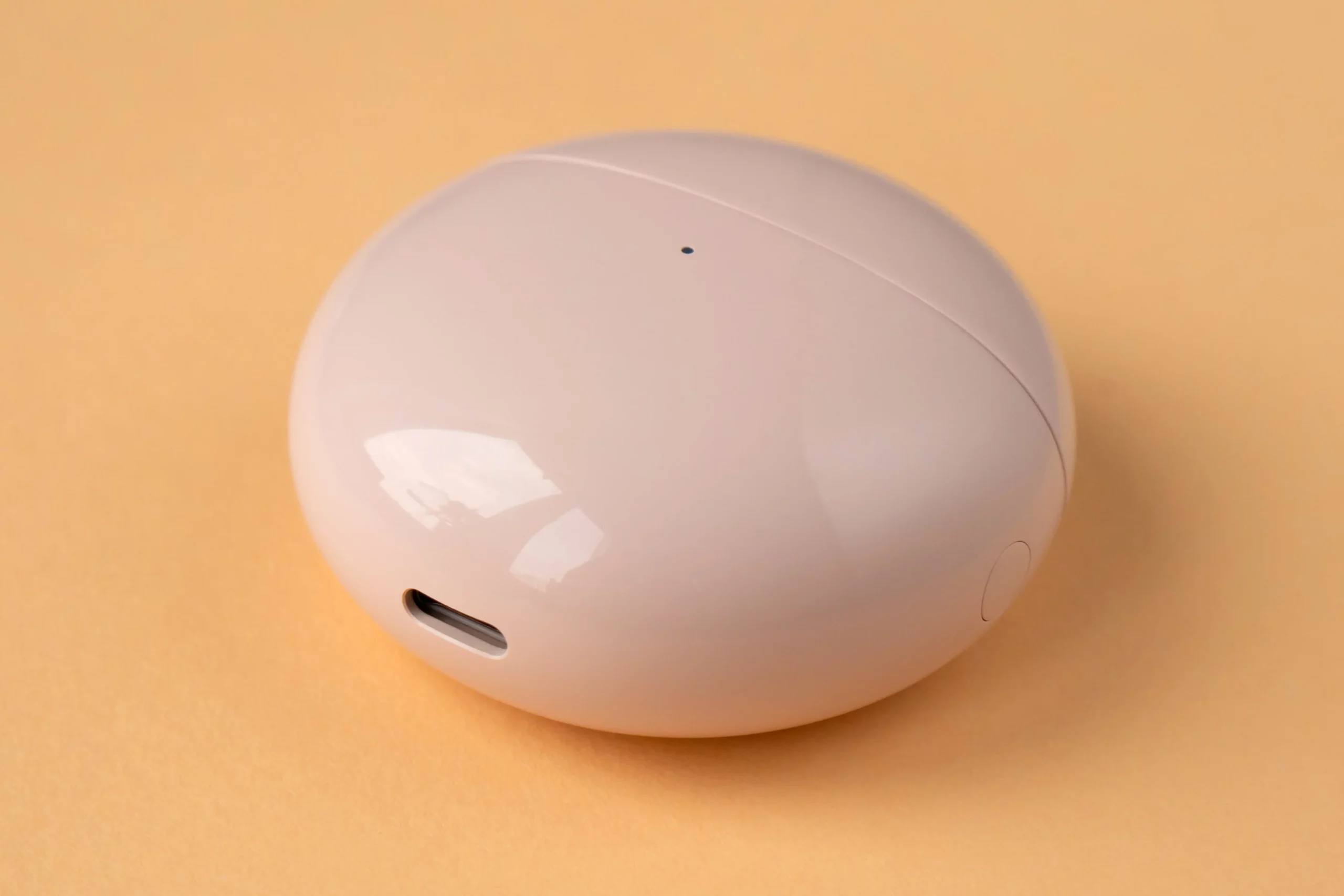 Кейс изготовлен из глянцевого пластика, имеет идеально круглую форму. Сбоку — кнопка сопряжения, в центре — светодиодный индикатор, снизу — Type-C для зарядки. Все абсолютно стандартно.