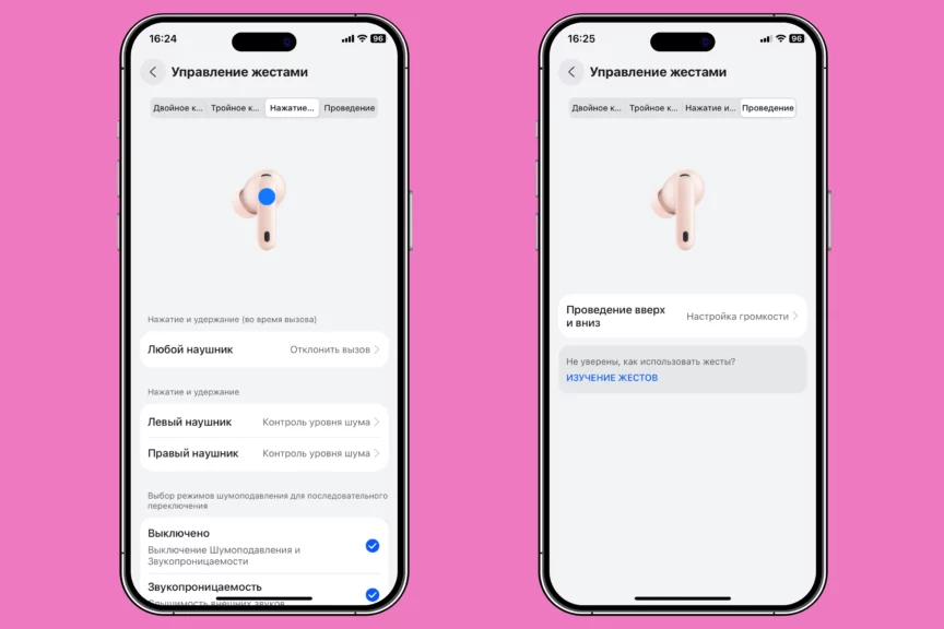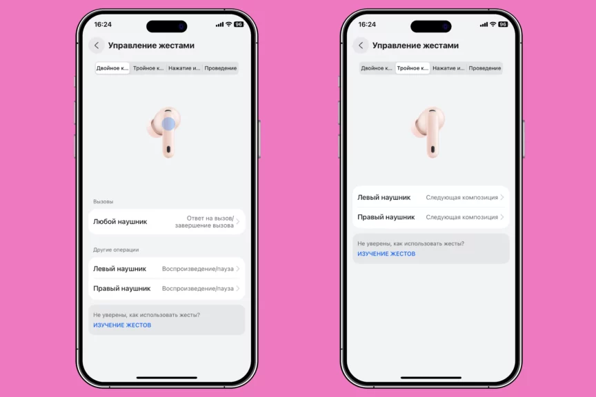 Для управления воспроизведением используются касания ножки наушника: двойные, тройные, нажатие и удержание, слайд. В общем, доступен полный набор жестов. Их можно настроить отдельно для левого и правого наушника. Однако и с настройками по умолчанию все уже работает отлично: