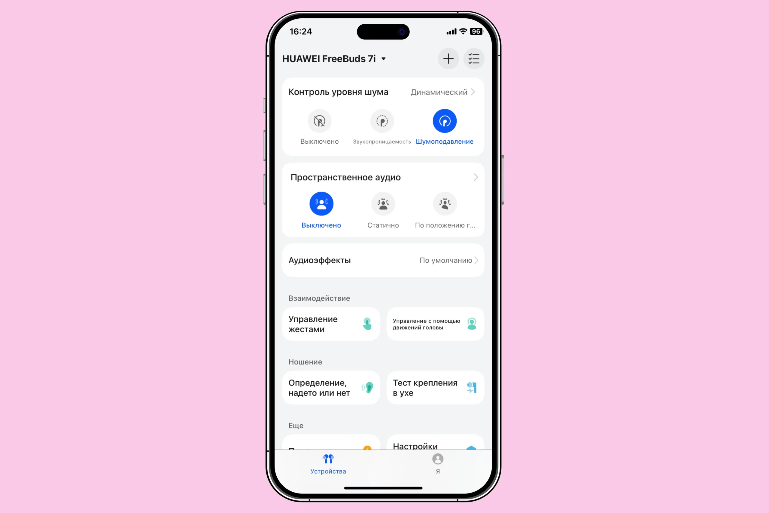 К плюсам реализации шумоподавления в HUAWEI FreeBuds 7i я отнесу отсутствие ощущения давления на уши. Иными словами, ты не чувствуешь себя оглушенным. У некоторых конкурентов шумоподавление работает не так деликатно.