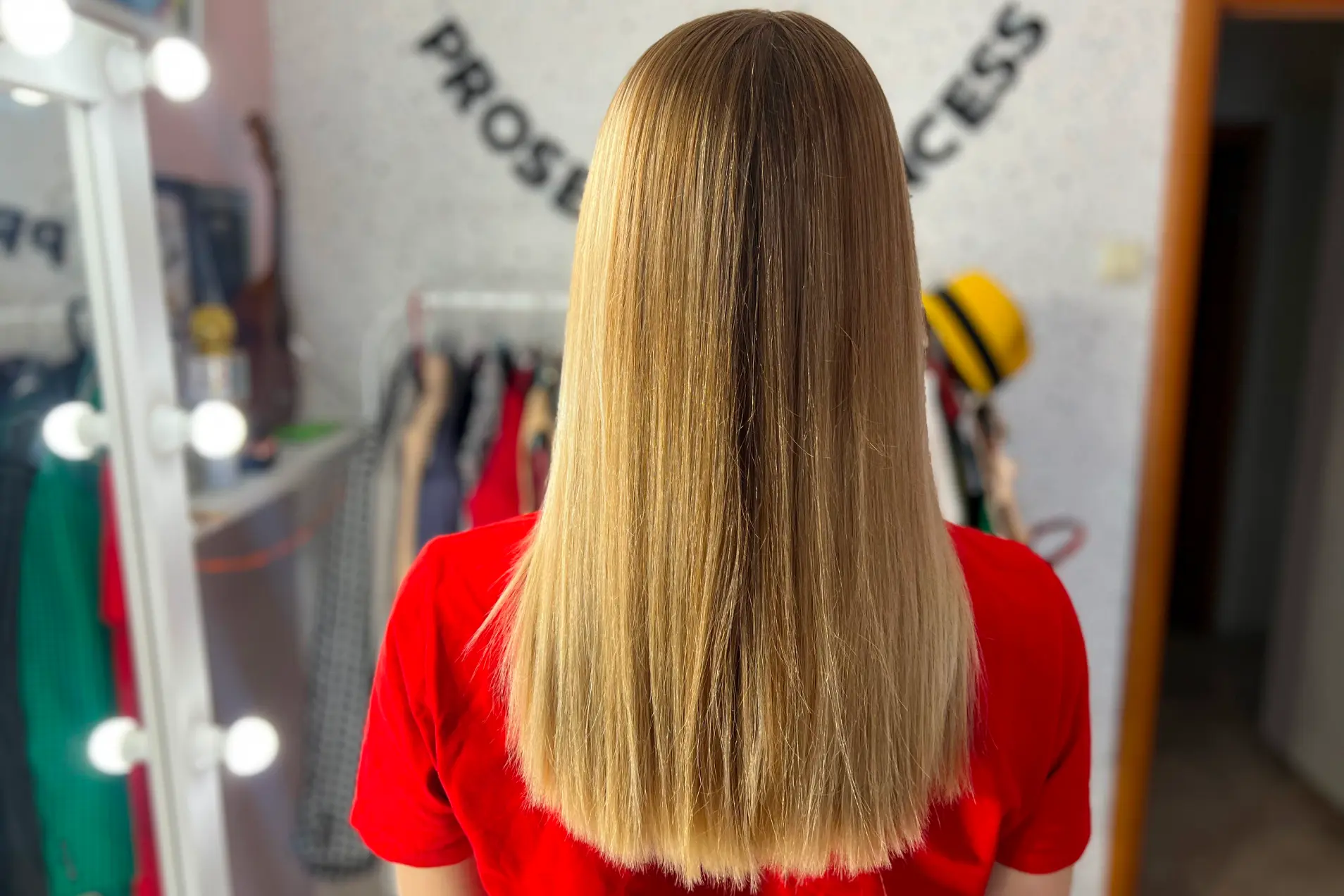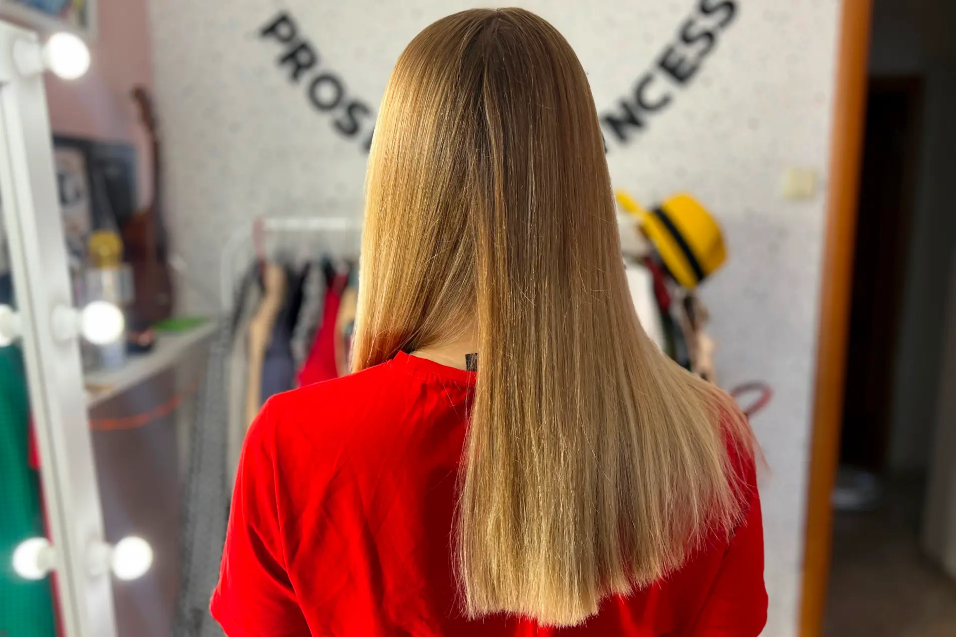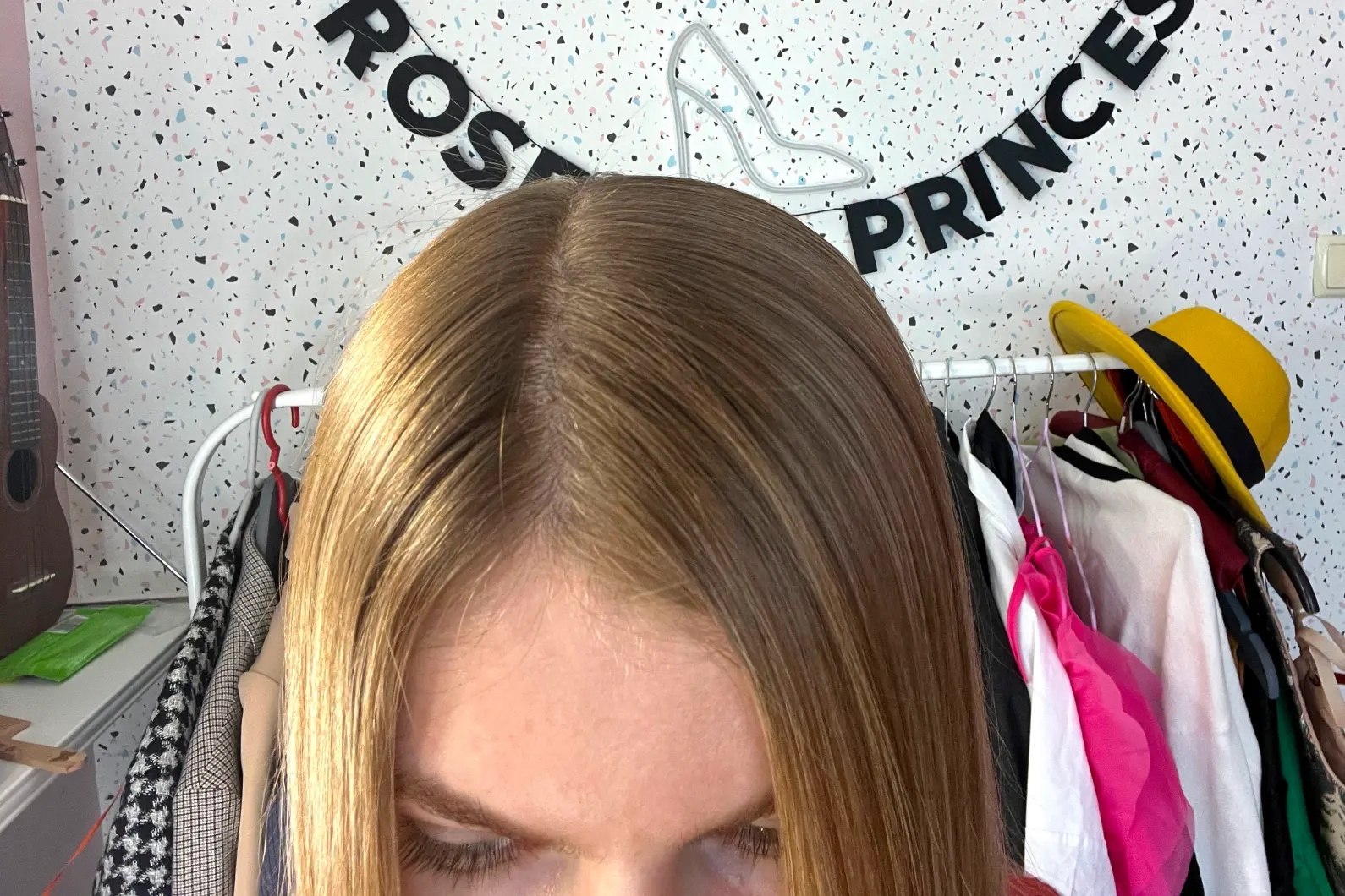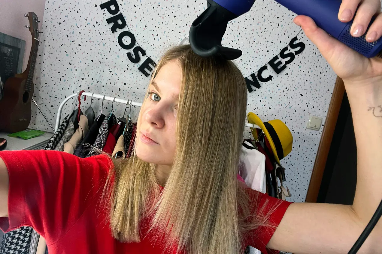 У меня волосы ниже лопаток, окрашенные в блонд, достаточно густые. Для чистоты эксперимента я разделила их на две части. Обработала всю голову термозащитой — рекомендую использовать при работе и с плойками, и с феном. Так волосы меньше повреждаются. Одну сторону сушу с концентратором, другую — с насадкой для бережной сушки. Посмотрим, есть ли какая-то разница.