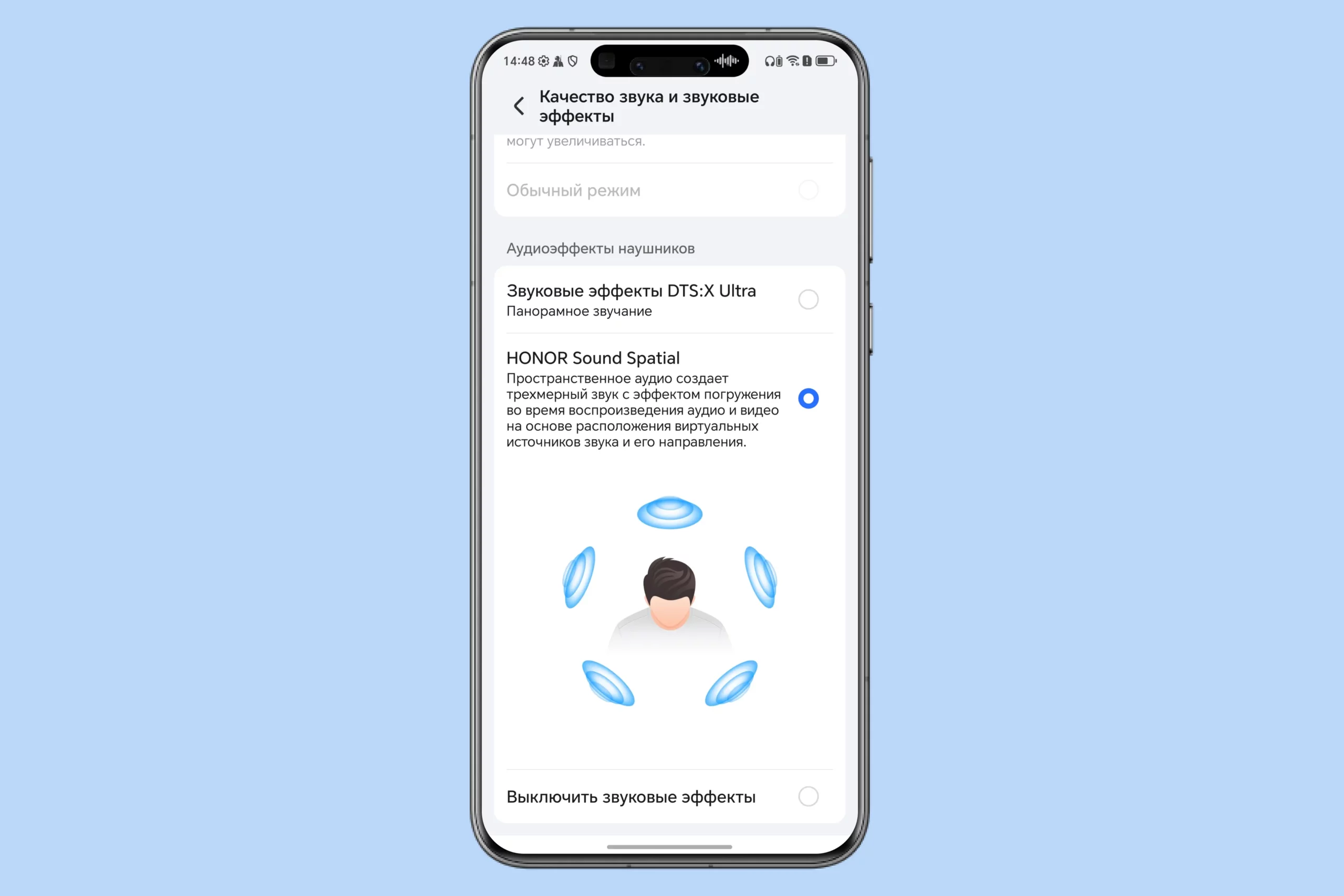 Лишних шумов или хрипа я не услышала ни при прослушивании треков на максимальной громкости, ни при разговоре по громкой связи. Можно выбрать разные аудиоэффекты: «Премиум-басы», «Объемное 3D-звучание», обычный режим. А когда подключаешь наушники, то появляется выбор аудиоэффектов для них. Мне больше всего зашел HONOR Sound Spatial. Он добавляет трехмерный звук с эффектом погружения во время воспроизведения трека. Также есть DTS:X Ultra, который отвечает за объемное звучание, и есть просто отключение всех звуковых эффектов.