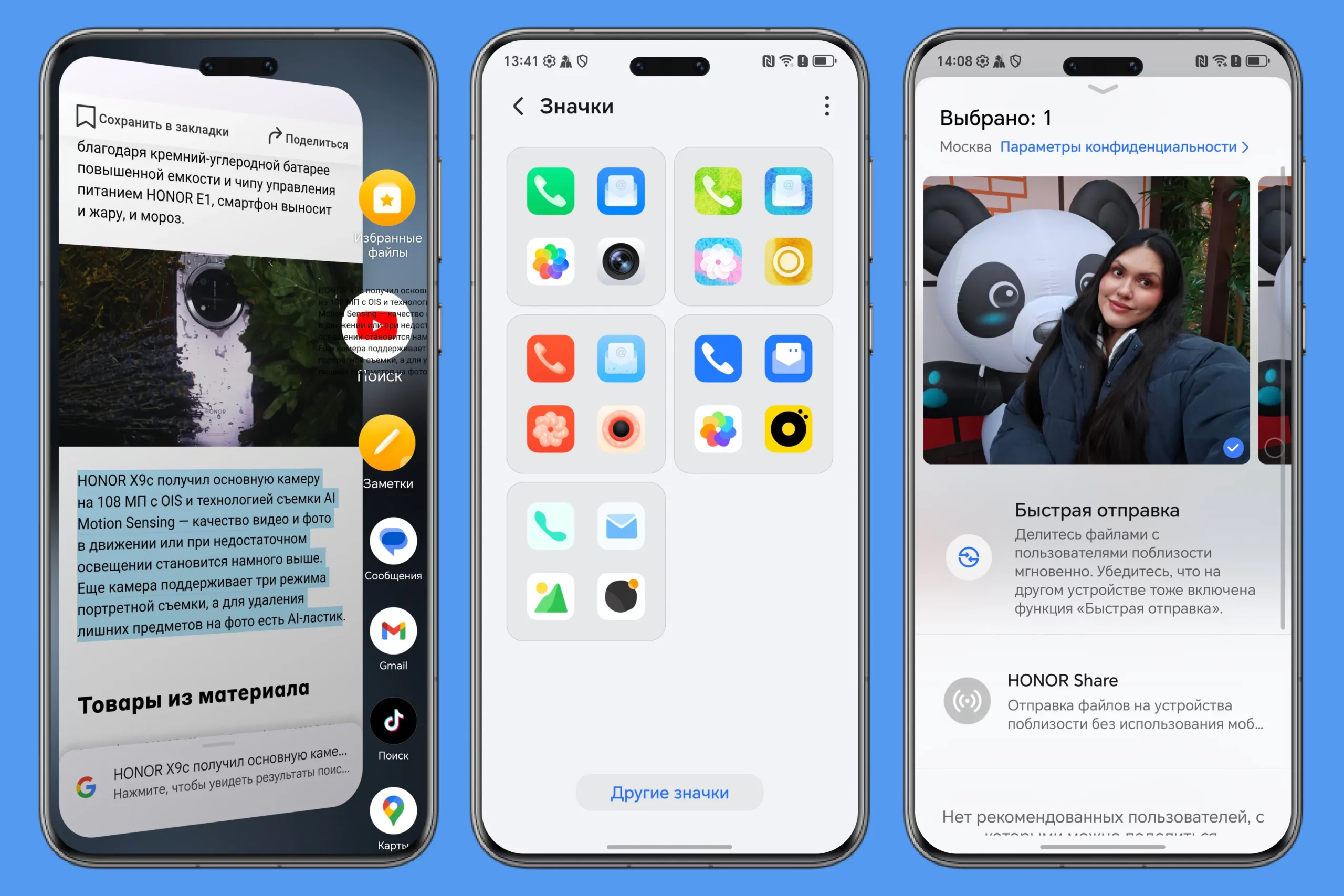 Классические для HONOR фичи тоже никуда не делись. Например, Magic Portal: выбираем текст или изображение на экране и перетаскиваем его в другое приложение (большой бонус, что теперь можно работать и с российскими сервисами). Или HONOR Share — функция обмена данными между планшетами, смартфонами и ноутбуками HONOR.