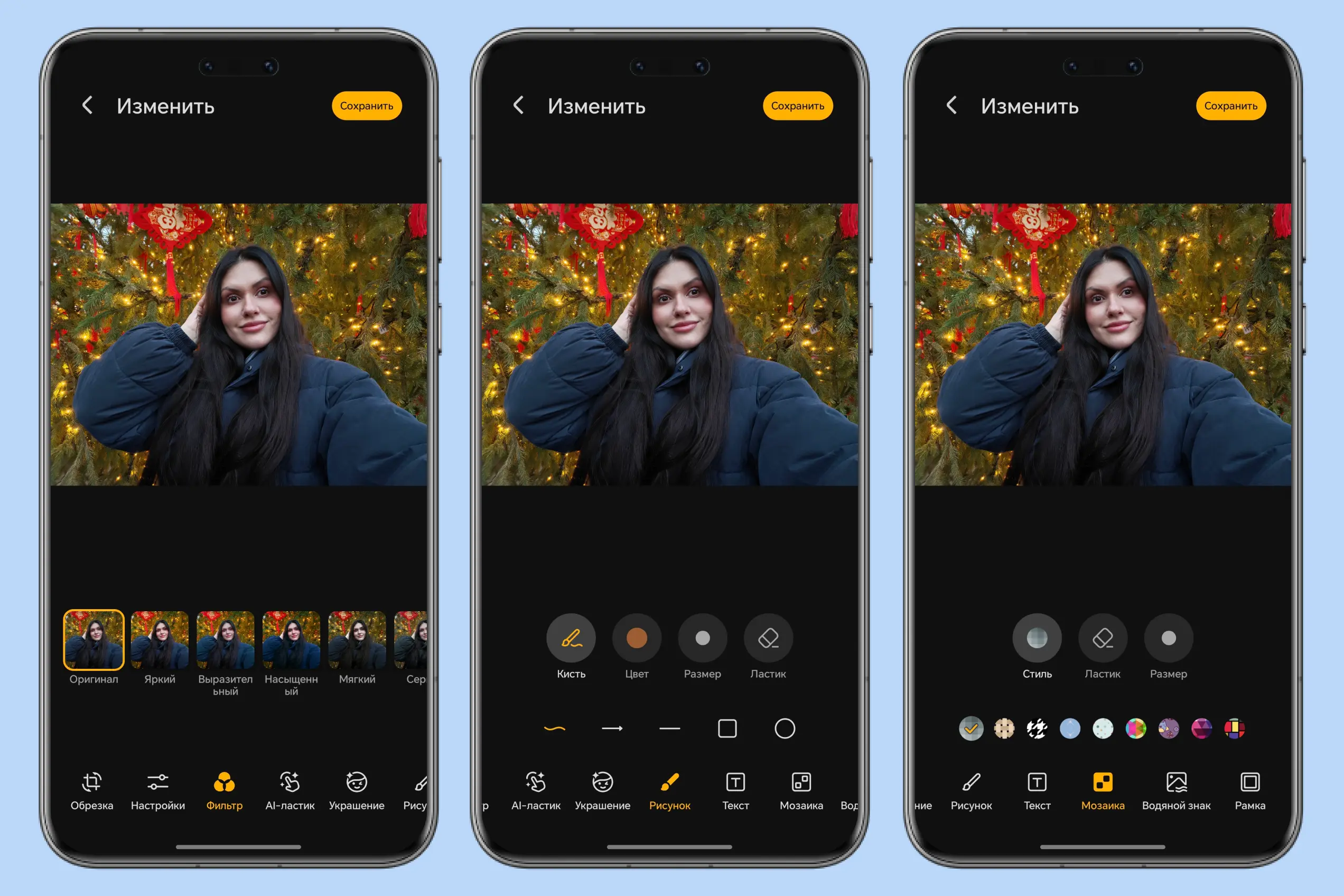 Фотографии и видео можно отредактировать буквально «на коленке». Конечно, это не профессиональная ретушь или монтаж, но для работы здесь и сейчас арсенала точно хватит. У фото можно не только поставить фильтры, настроить формат, обрезать лишнее, добавить текст с рисунками, но и удалить ненужные объекты с помощью AI-ластика. Также есть стикеры, водяные знаки и эффект размытия.