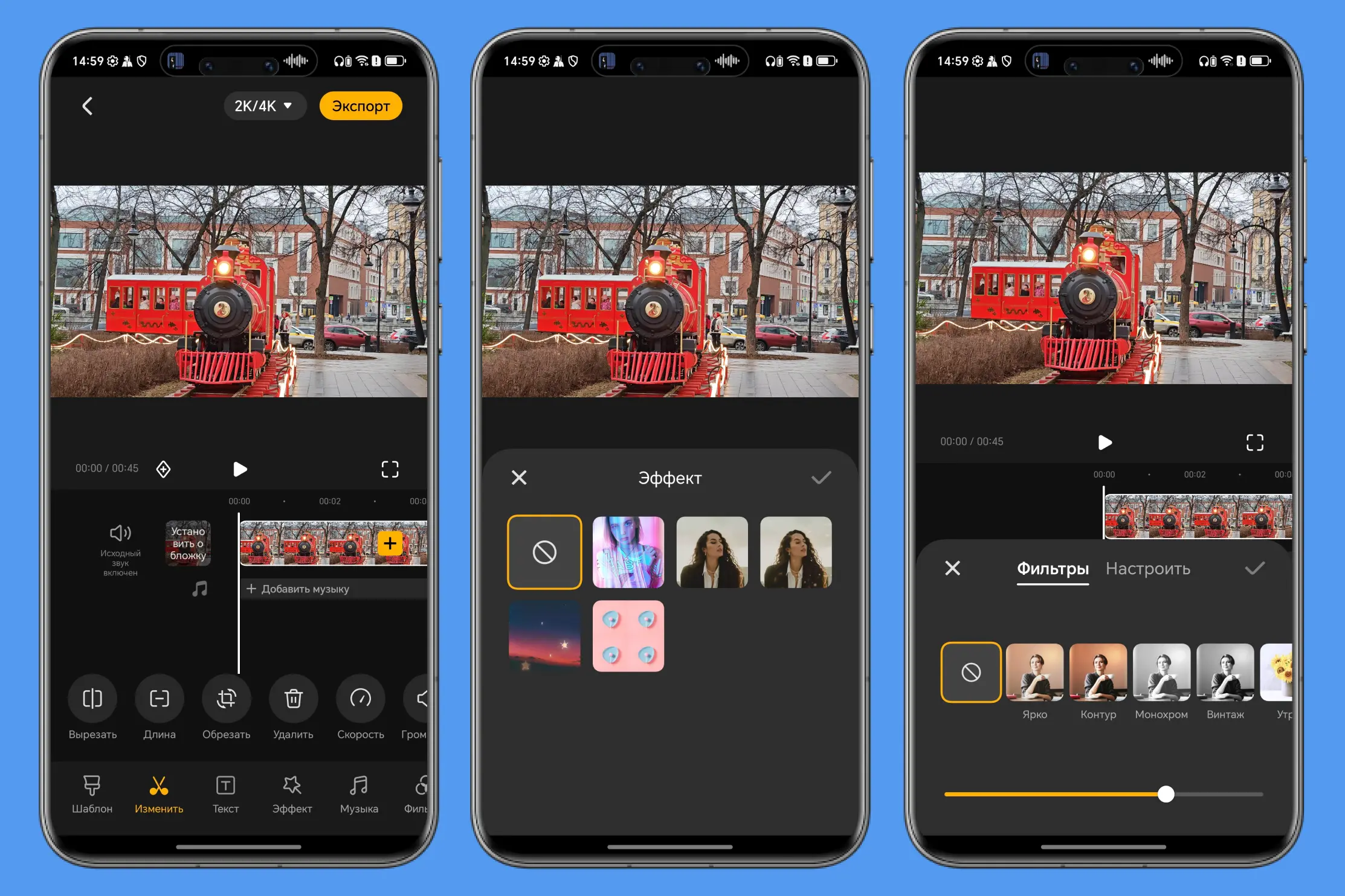 Видео тоже можно первично смонтировать: настроить форматы, докинуть эффекты (правда, их совсем мало), обрезать лишние фрагменты, настроить фон или добавить музыку.