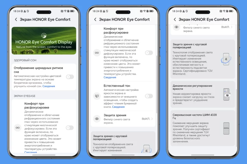 Но что по защите зрения? В экране HONOR Eye AI-Comfort используется аж семь разных технологий, снижающих нагрузку на зрение и не только. Например, ИИ знает о циркадных ритмах сна и автоматически меняет цветовую температуру экрана вечером и ночью, чтобы было проще засыпать. Еще здесь есть динамическая регулировка яркости, функция AI-дефокус, которая снижает нагрузку на глаза, сверхвысокая частота ШИМ, круговая поляризация экрана, с которой изображение воспринимается более естественным. Остались и стандартный режим электронной книги, переключение между светлой и темной темами, регулировка цветового режима. На практике за две недели активного тестирования я ни разу не испытала дискомфорта в глазах.