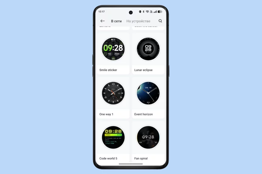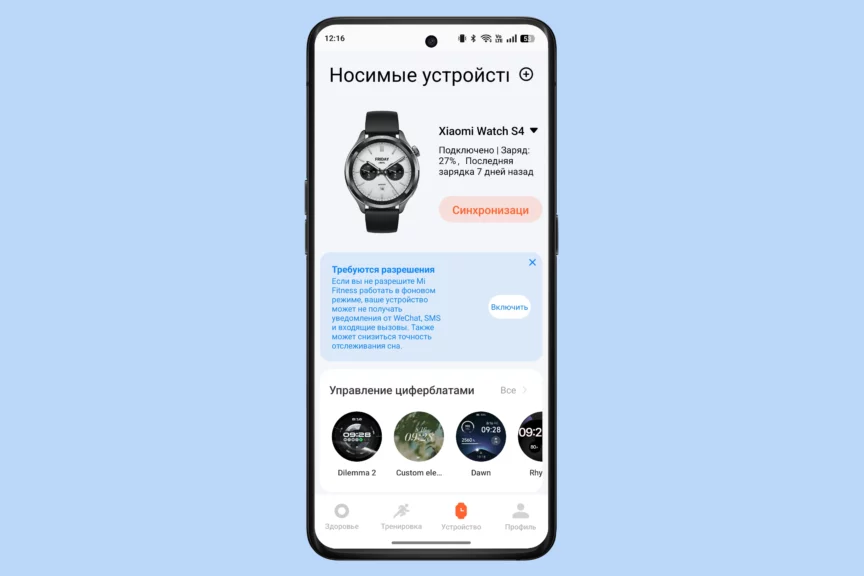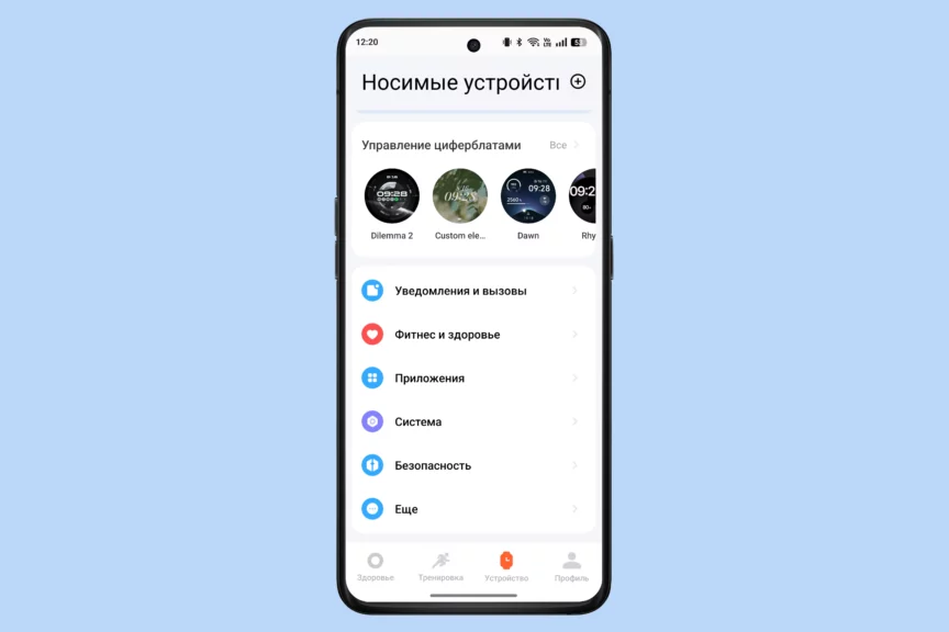 Приложение Mi Fitness имеет четыре основных вкладки: «Здоровье», «Тренировка», «Устройство» и «Профиль». Во вкладке «Устройство» можно настроить основные параметры смарт-часов, в том числе загрузить новые циферблаты. Выбрать есть из чего, альтернативные циферблаты выглядят весьма интересно.