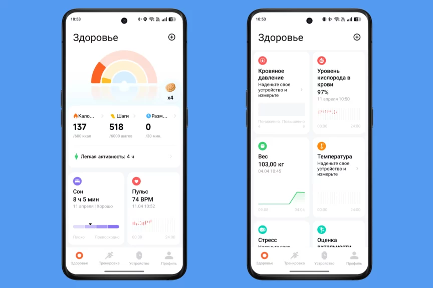 «Здоровье» контролирует основные параметры, следя, чтобы они не выходили за установленные нормы, а «Витальность» оценивает активность в течение недели. Измерение артериального давления и температуры Xiaomi Watch S4 не поддерживают. В приложении эти окошки будут пустыми.