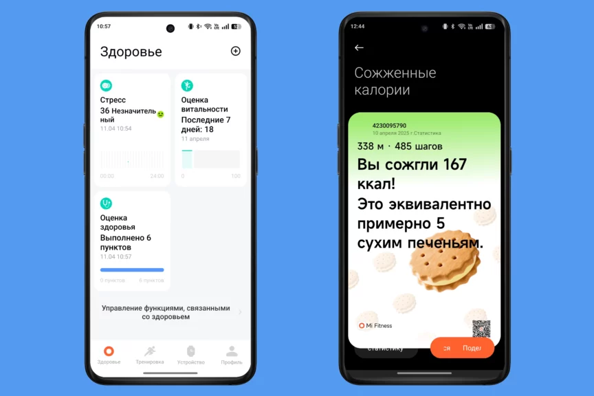 Любителям колец активности расстраиваться не стоит: в Xiaomi Watch S4 они тоже есть, только выглядят как полукольца. А еще мне понравилось, как подсчитываются потраченные калории: приложение выводит результат не только в сухих цифрах, но и в печеньях или рожках мороженого.