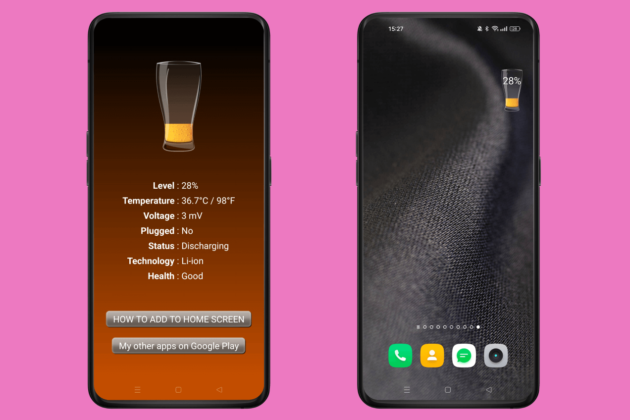 Оригинальный виджет-дизайн для оформления информации о батарее вашего смартфона. Принцип работы простейший. 100% заряд батареи — бокал с пивом полон до краев. 50% — наполовину пуст или наполовину полон?