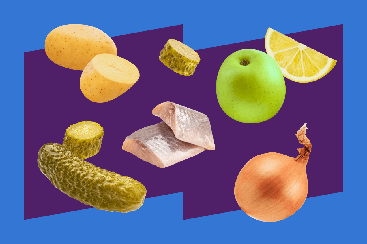 Для селедочного салата вам потребуется маринованная сельдь, отварной картофель, зеленое яблоко, репчатый лук, маринованные огурцы, сок четверти лимона. Для заправки — смесь сметаны и майонеза. Секрет в том, чтобы нарезать все ингредиенты настолько мелко, насколько это возможно, чтобы все вкусы смешались и невозможно было выбрать и попробовать что-то одно. Только не переусердствуйте, иначе вместо шведского салата получится каша. Для удобства можете воспользоваться специальной овощерезкой.
