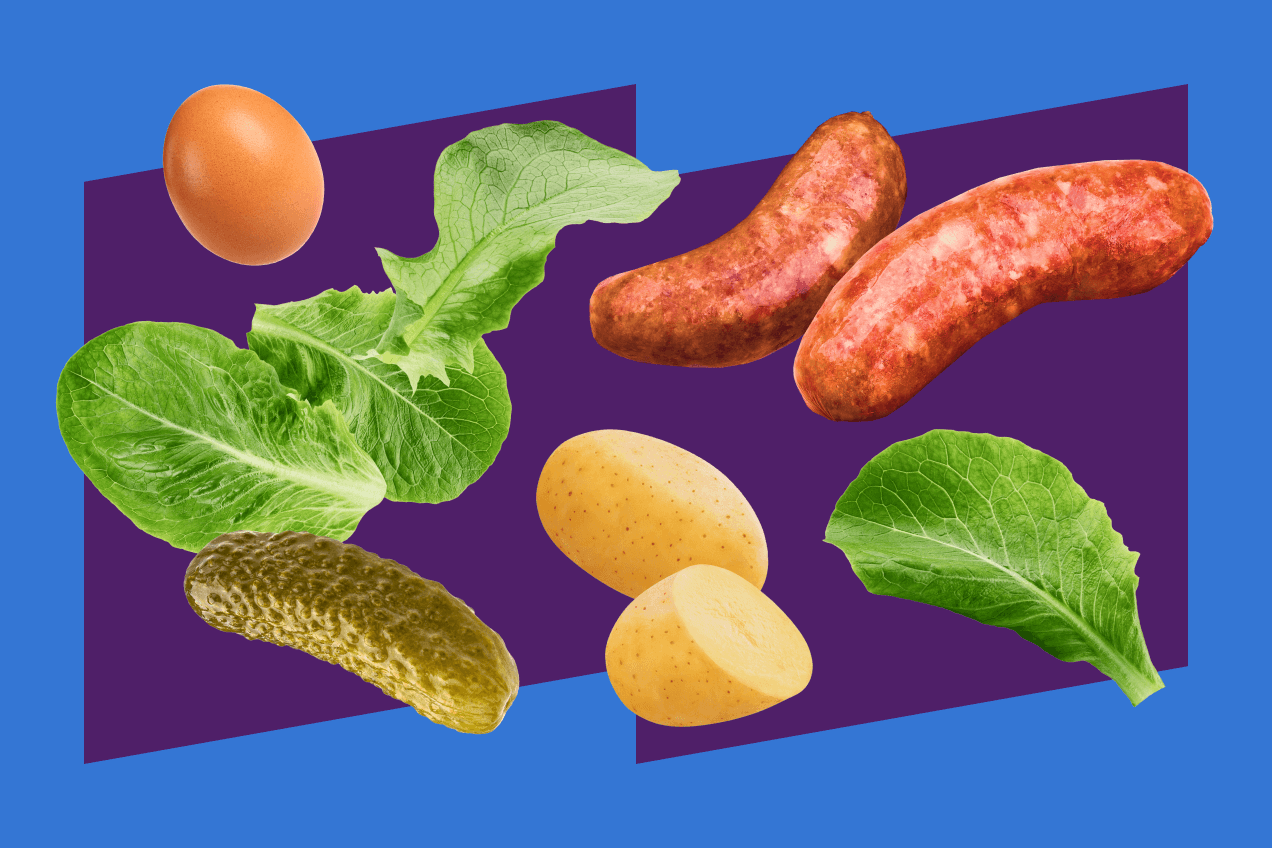 Процесс приготовления простой и незатейливый. 2−3 копченые колбаски или копченую куриную грудку, несколько вареных картофелин, 2−3 вареных яйца и маринованные огурцы нужно нарезать и перемешать. Можете не мельчить и резать крупными кусками, а корнишоны можно и вовсе добавить целиком.