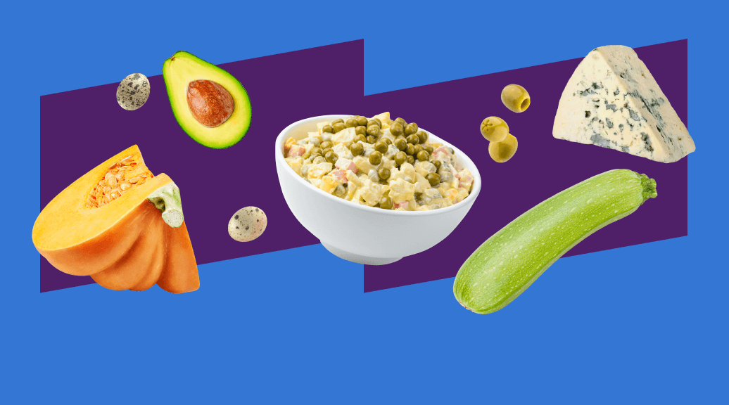 Очистите авокадо (1 шт.) от кожуры, удалите косточку. Мякоть нарежьте кубиками. Аналогично нарежьте кубиками небольшой цукини (1 шт.), свежий огурец (1 шт.), сырую морковь или тыкву (200−250 г). Соедините все ингредиенты. Добавьте размороженный зеленый горошек (200 г). Для заправки смешайте льняное или оливковое масло (2−3 ст. л.), горчицу (1/2−1 ч. л.), соль и прованские травы по вкусу. Готовым соусом залейте оливье и хорошенько перемешайте.