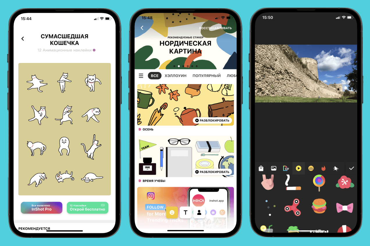 InShot является бесплатным со встроенными покупками. Например, для безграничного использования стикеров в своих роликах понадобится Pro-подписка. В то же время отдельные стикер-паки можно скачать за просмотр рекламы. Даже логотип приложения, который InShot вставляет в видео без покупки Pro-версии, таким же образом можно убрать перед сохранением ролика, просто посмотрев рекламный ролик.