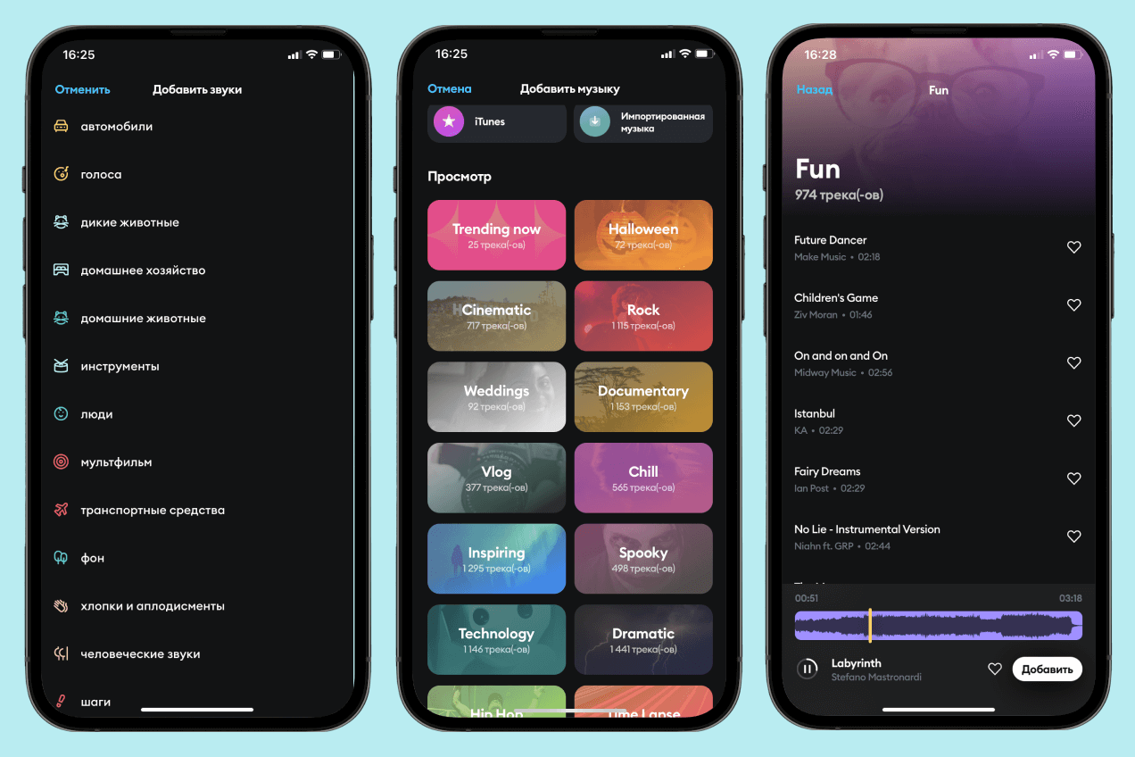 И все же почему же платная подписка стоит так дорого? Ведь есть же другие приложения, которые позволяют смонтировать видео на айфоне бесплатно. Во-первых, в Splice много классных эффектов. А во-вторых, по подписке открывается доступ к огромной фонотеке с музыкой для монтажа. Да-да, это не просто какие-то песни, а именно адаптированные для монтажа произведения небольшой длины, тщательно систематизированные и разбитые по тематикам. Кто хоть раз монтировал ролики, понимает, как трудно бывает подобрать музыку. В Splice эта проблема решена на 100%.