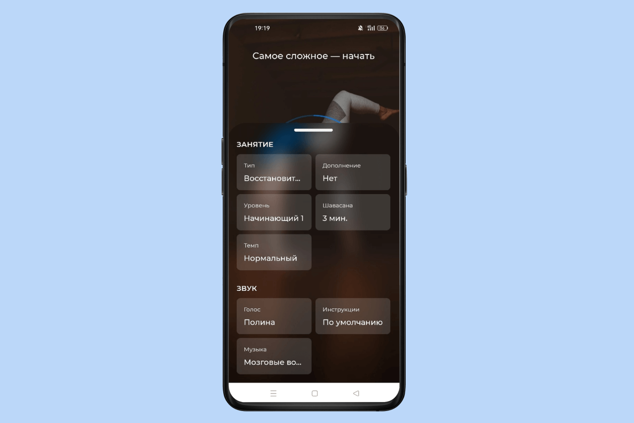 Занятия проходят под музыку, а тип голосового сопровождения можно изменить в настройках: установить звуковой сигнал или немного прокачать свой английский, выбрав озвучку на этом языке. Можно отключить голосовые комментарии вовсе, визуального ряда будет достаточно для повторения даже самых сложных асан.