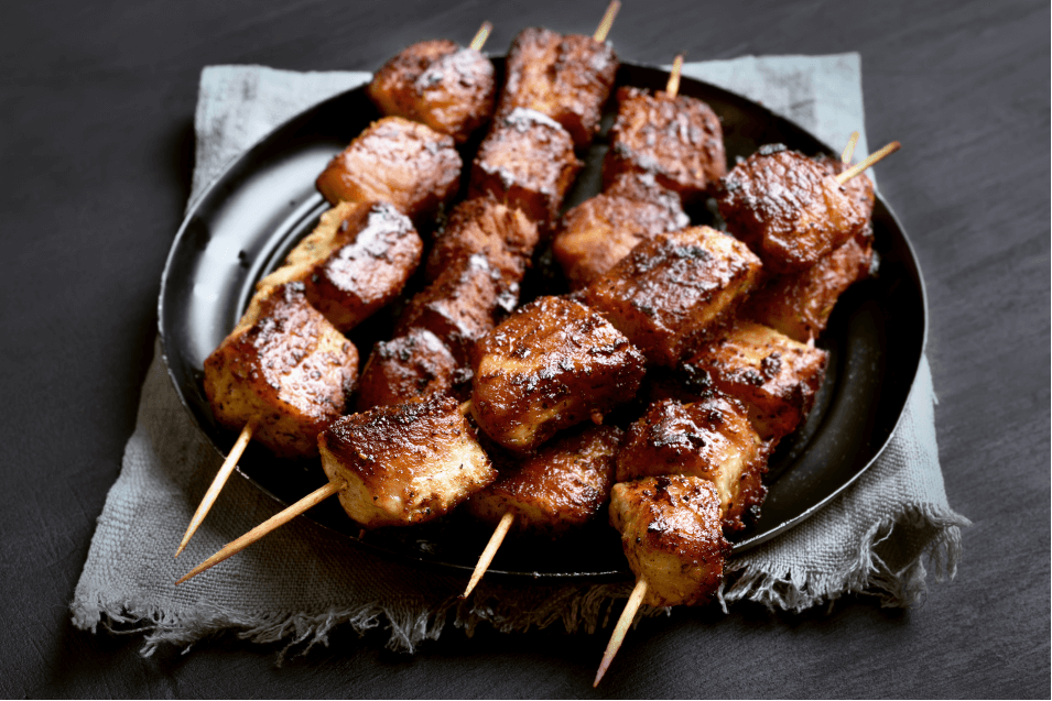 Этот маринад хорошо сочетается не только с мясом, но и с овощами. Чтобы подарить их одновременно, нарежьте куриное мясо кубиками со стороной не больше 2 см и нанижите на шампуры вперемежку с небольшими кусочками свежего болгарского перца (используйте разные цвета), колечками порея и помидорами черри. Оптимальное время для маринования мяса — 2−3 часа.