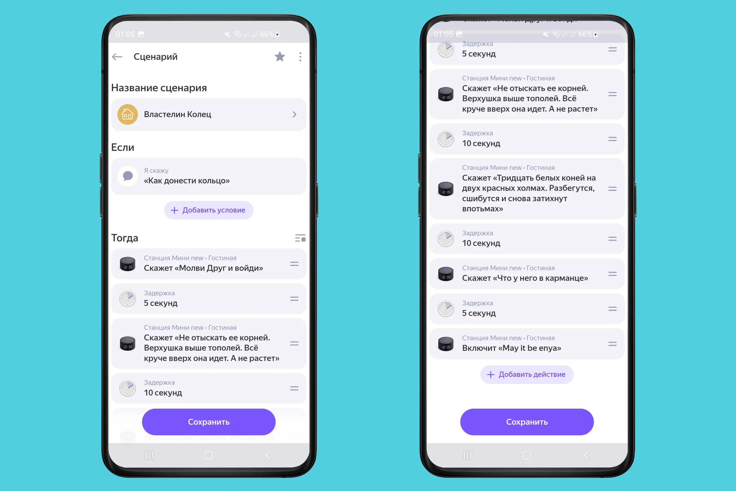 Или настройте сценарий по мотивам франшизы «Властелин колец». Помните наизусть все ответы на загадки Голлума? Устройте соревнование, кто ответит первым. Алиса будет задавать вопросы, а вы можете настроить период ее молчания, в который нужно успеть дать ответ. В этом случае вы ограничены только вашей фантазией и набором девайсов.