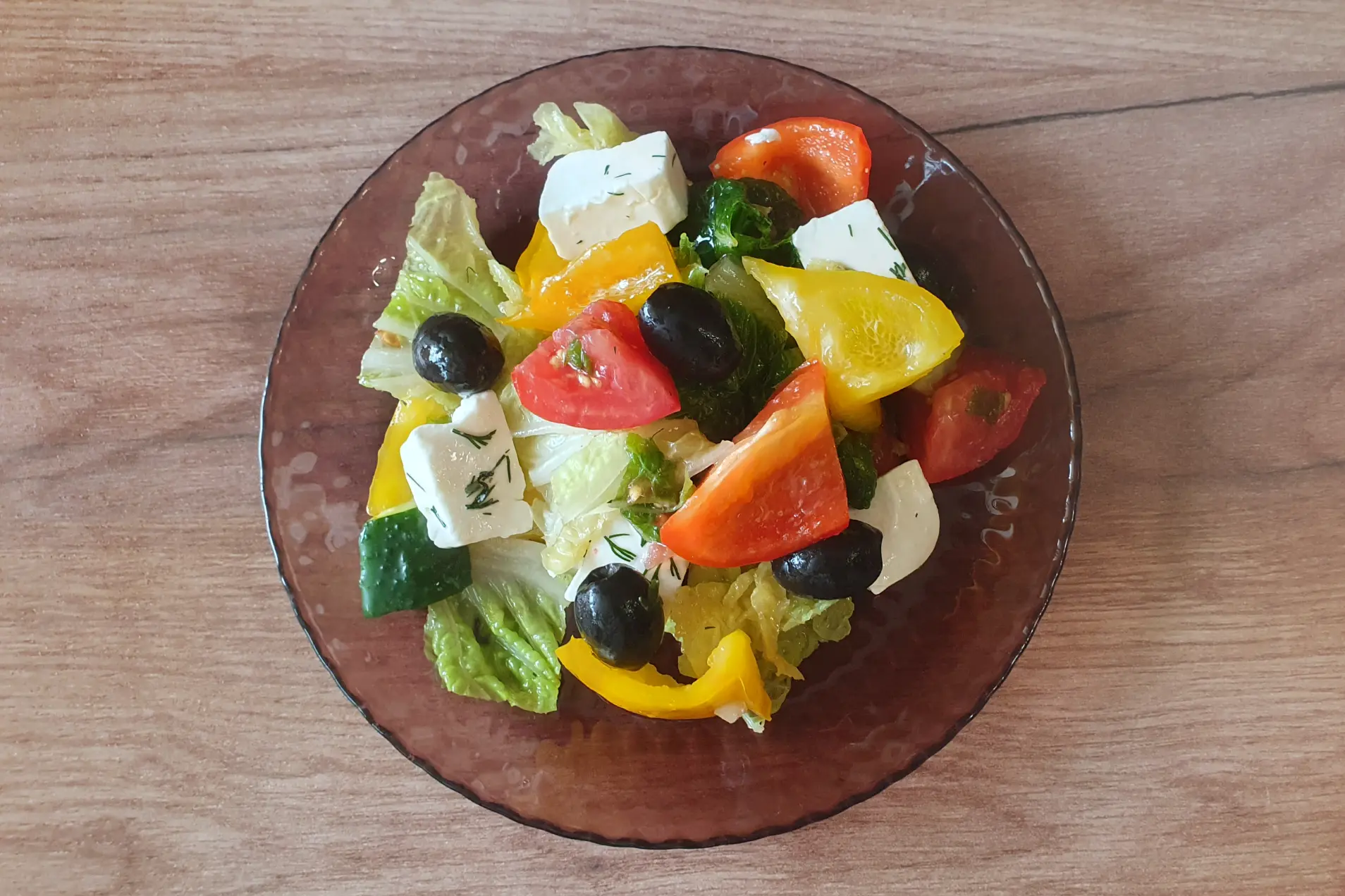 - Несколько маслин без косточек (предварительно слейте воду) добавьте целыми, сыр фета — нарежьте кубиками. Можно добавить салат айсберг или готовые салатные смеси, но это опционально, в оригинальном греческом салате такого ингредиента нет.