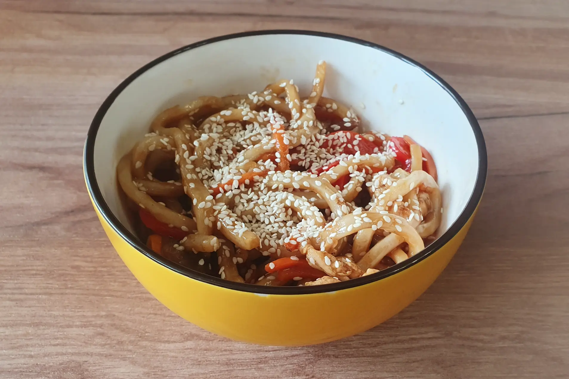 Комбинация нежной курицы, хрустящих овощей и аппетитной лапши удон — идеальный баланс вкусов. Приготовить удон дома можно даже без вока.