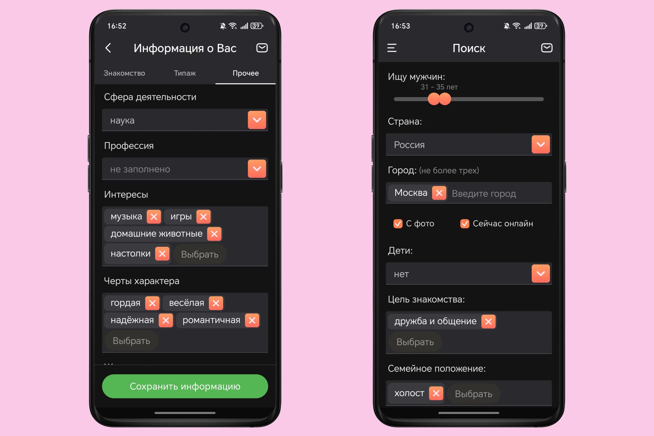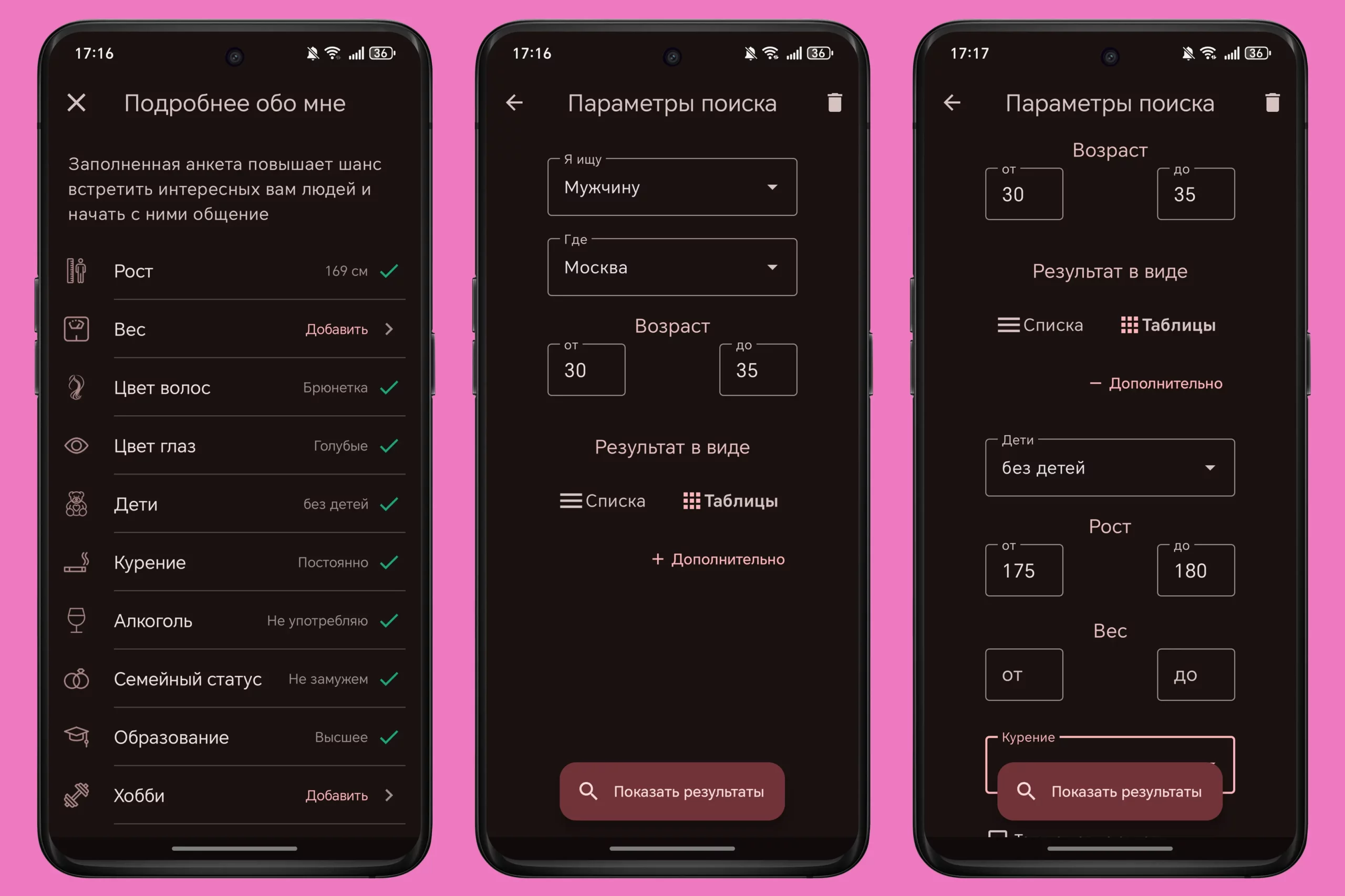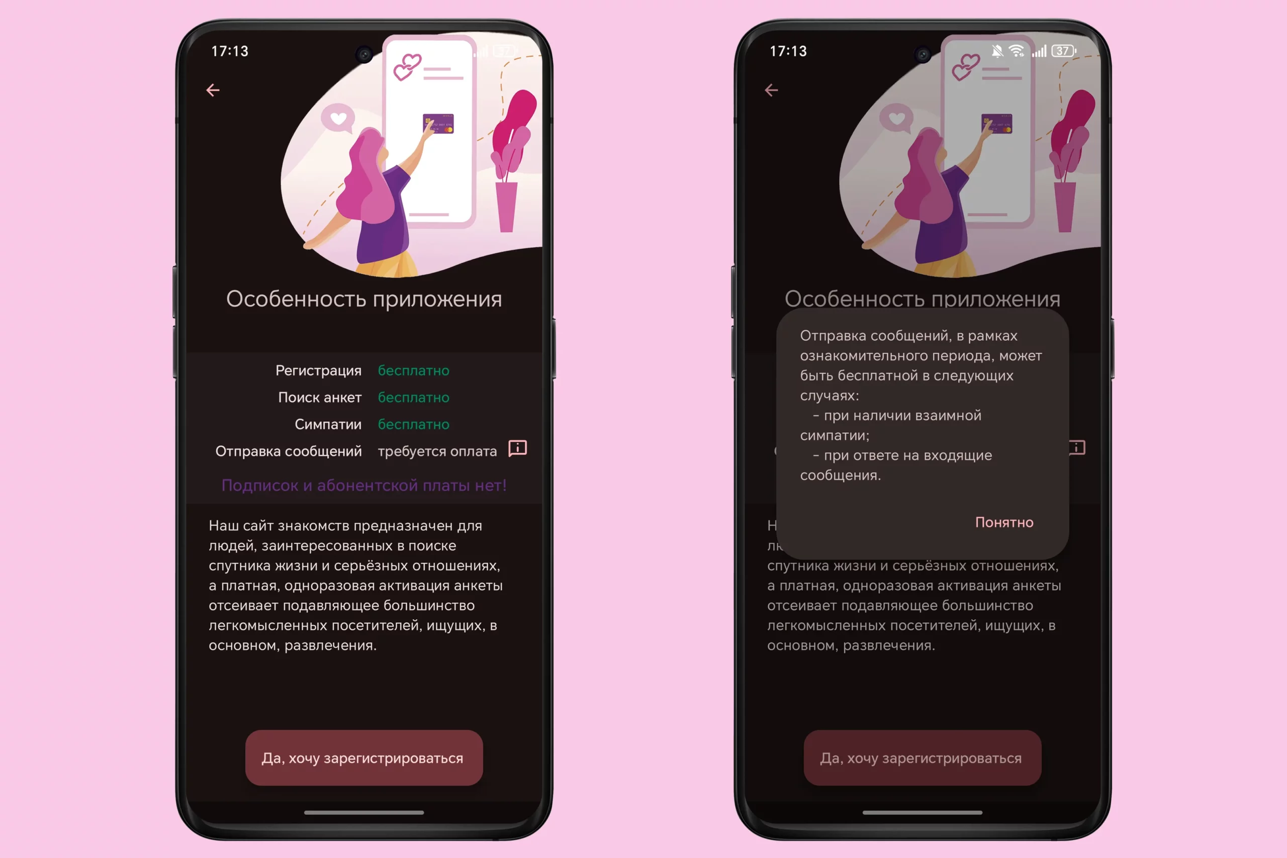 Общение начинается после заполнения небольшой анкеты и взаимной симпатии, переписка ведется в личных чатах. По отзывам пользователей, аудитория сервиса в целом более взрослая и спокойная, чем в развлекательных приложениях.