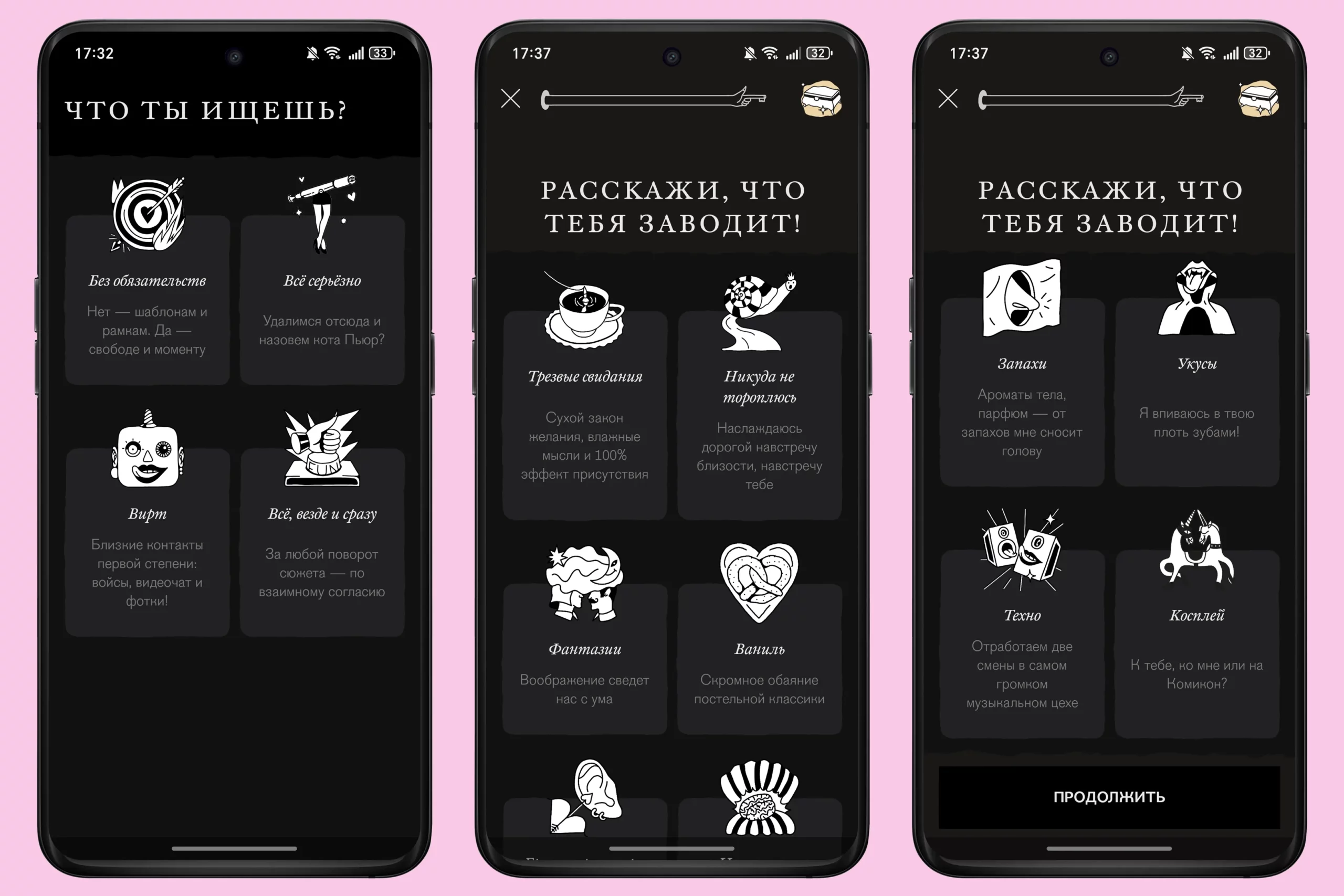 Приложение задумано так, чтобы в нем искали исключительно one-stand-night — знакомства на одну ночь, с продолжением или без него. Отмечая предпочтения и пожелания, вы продвигаетесь по заполнению анкеты и, добавив несколько фото и указав возраст, уже можете пуститься на поиски партнера. Пользоваться приложением приятно: нестандартное визуально, оно вместе с этим удобно и функционально.